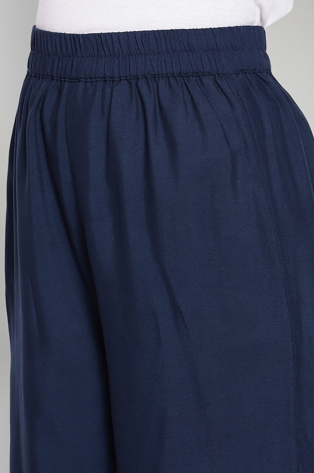 Blue round neck kurta having three-quarter sleeves and thread embroidery at front. Paired with solid blue trousers and dupatta.