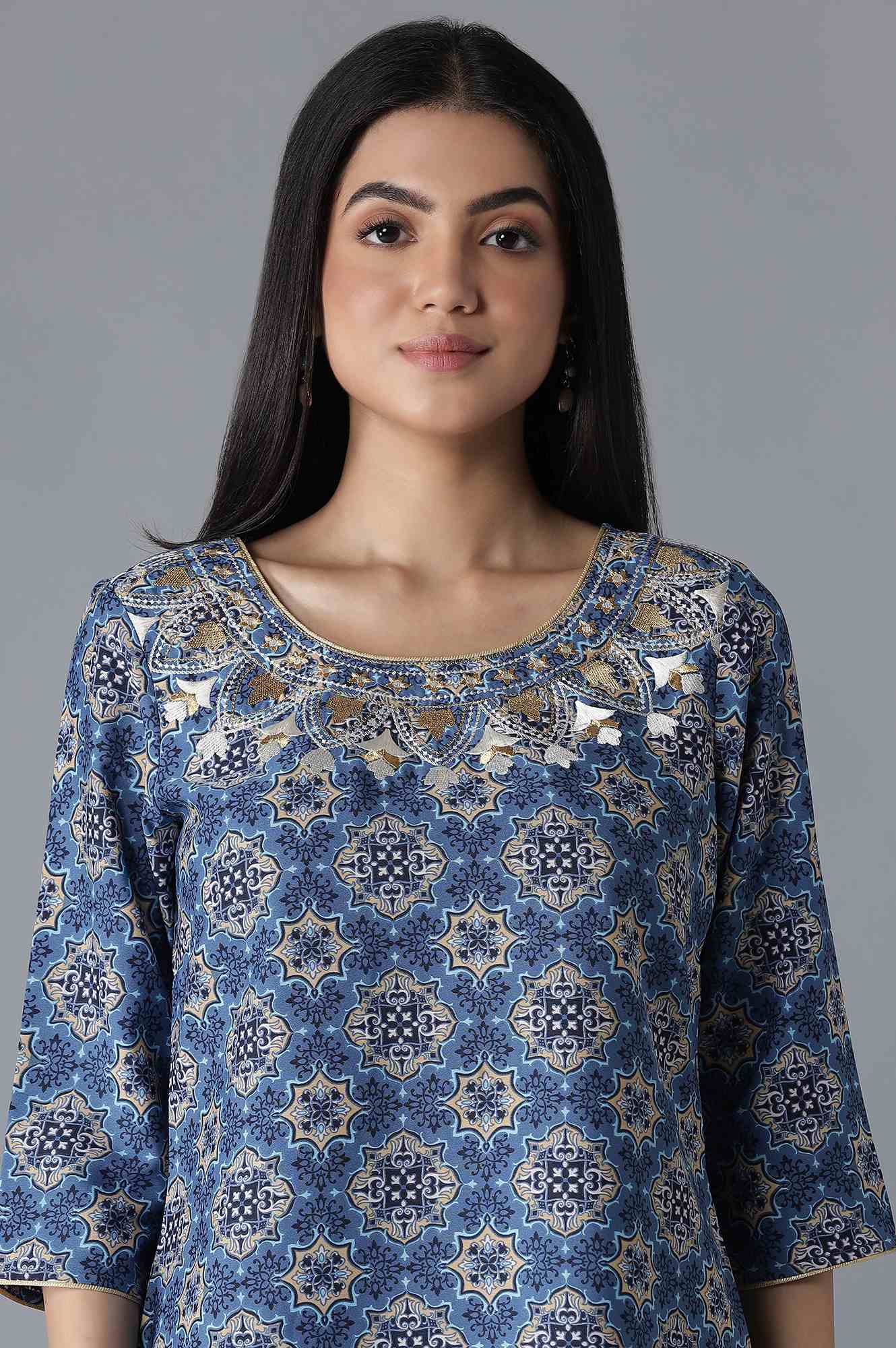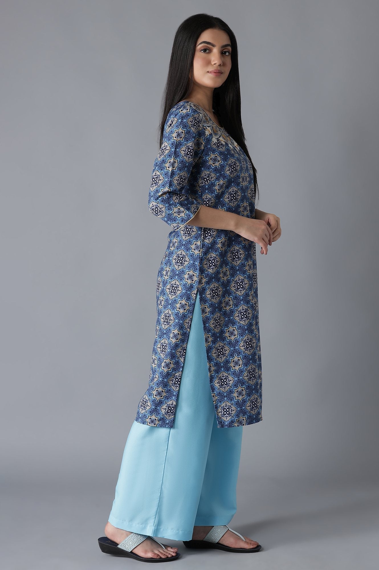 Go forth and dazzle them with this classy yet trendy kurta set. Featuring a blue all-over geometric print kurta that has a zari embroidered round neck and three-quarter sleeves. Well-matched with ankle length solid flared palazzos.
