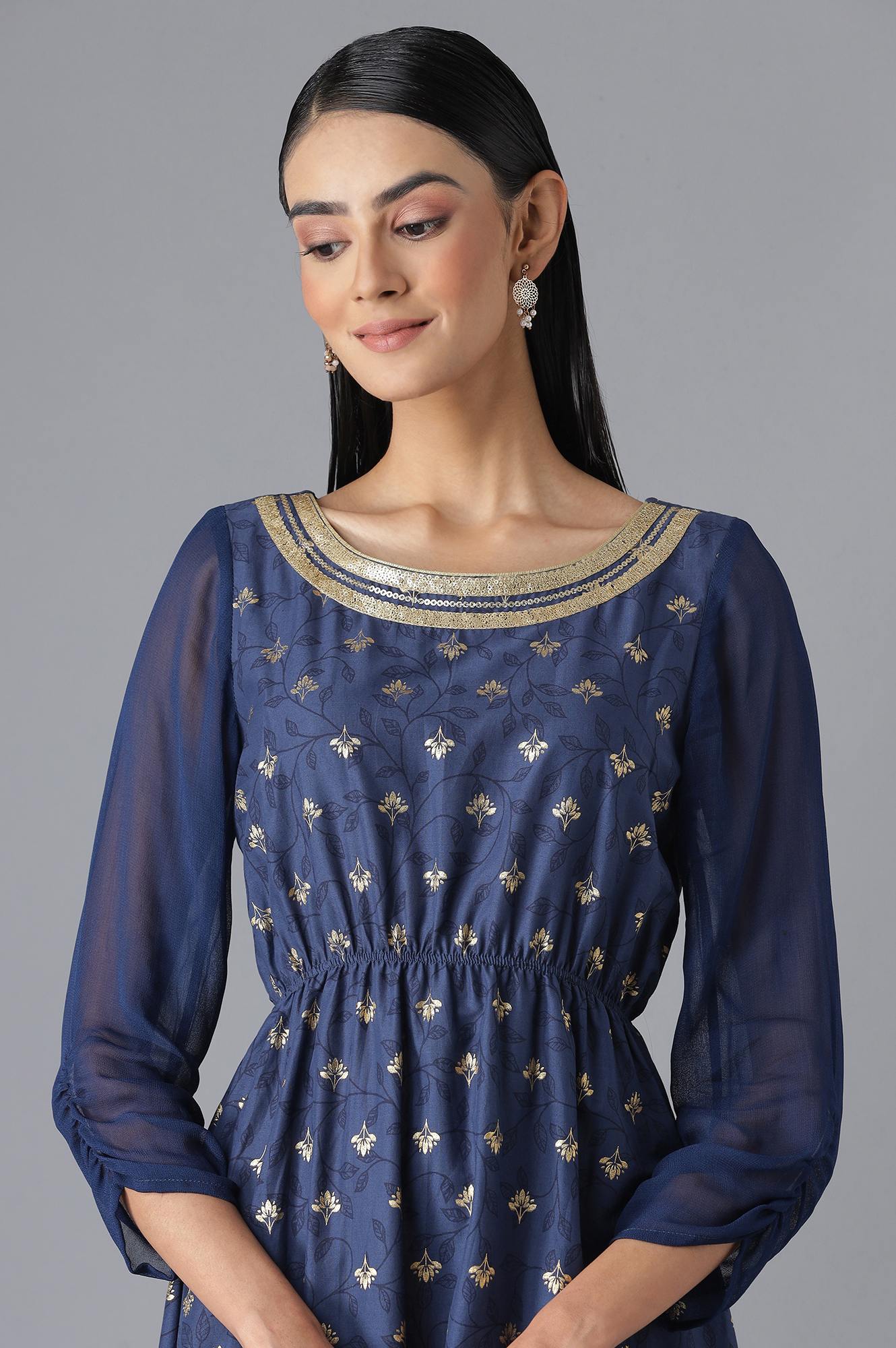 Slay your weekend brunches or dinner date in this beautiful flared floral print dress. The dress has round neck and three-quarter sleeves and comes with a dori and tassel tie-up.