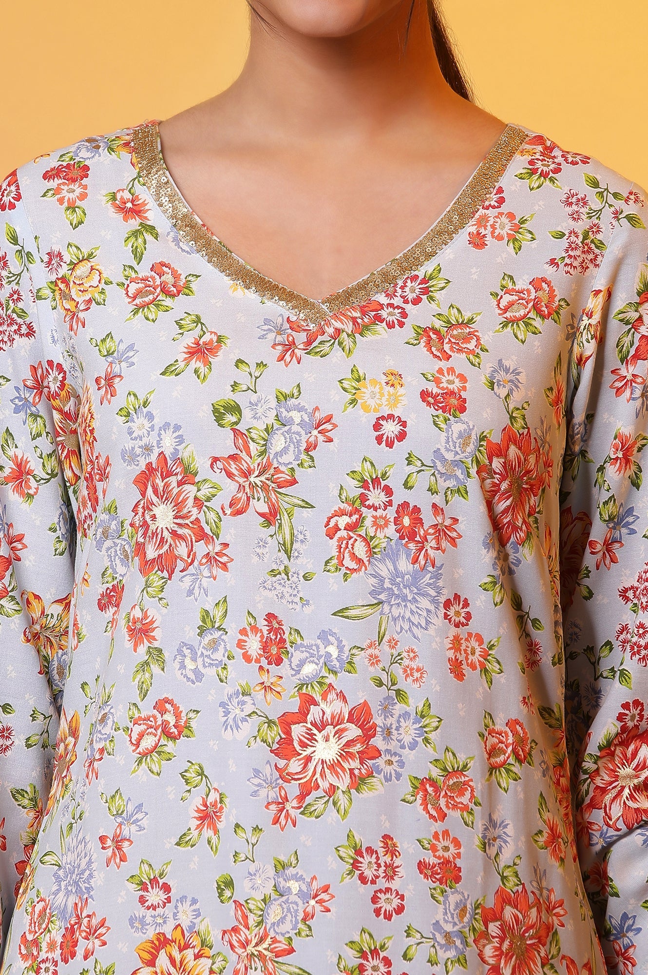 Blue Floral Printed Kurta with Embroidered Neck