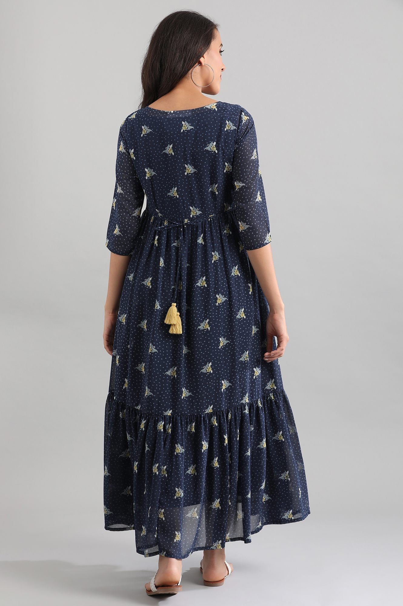 Blue gathered dress in round neck with V and 3/4th sleeves.