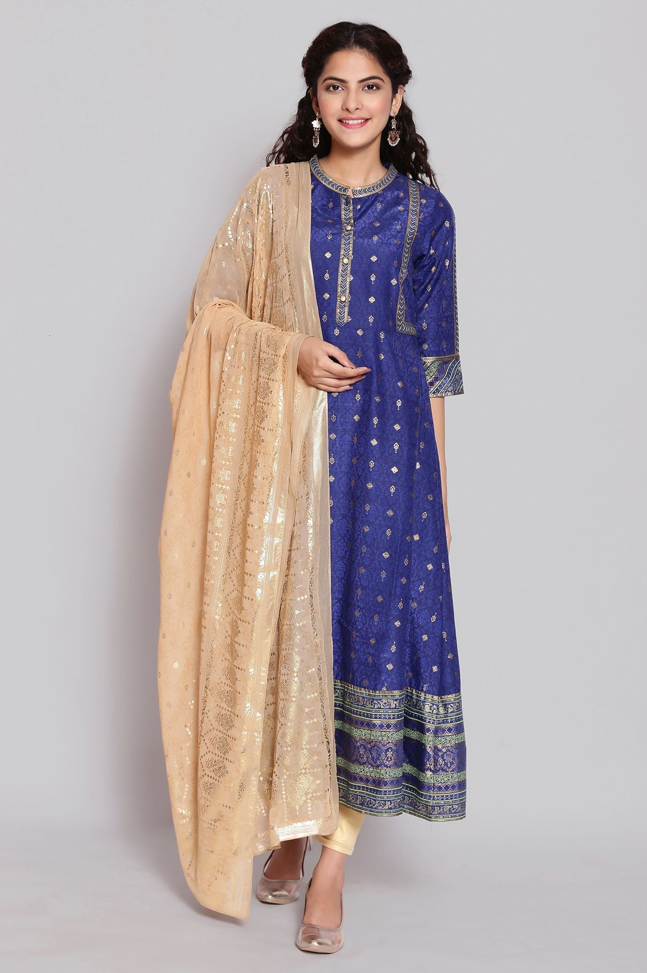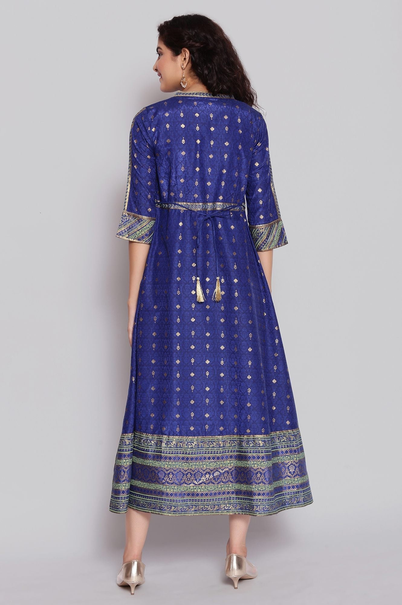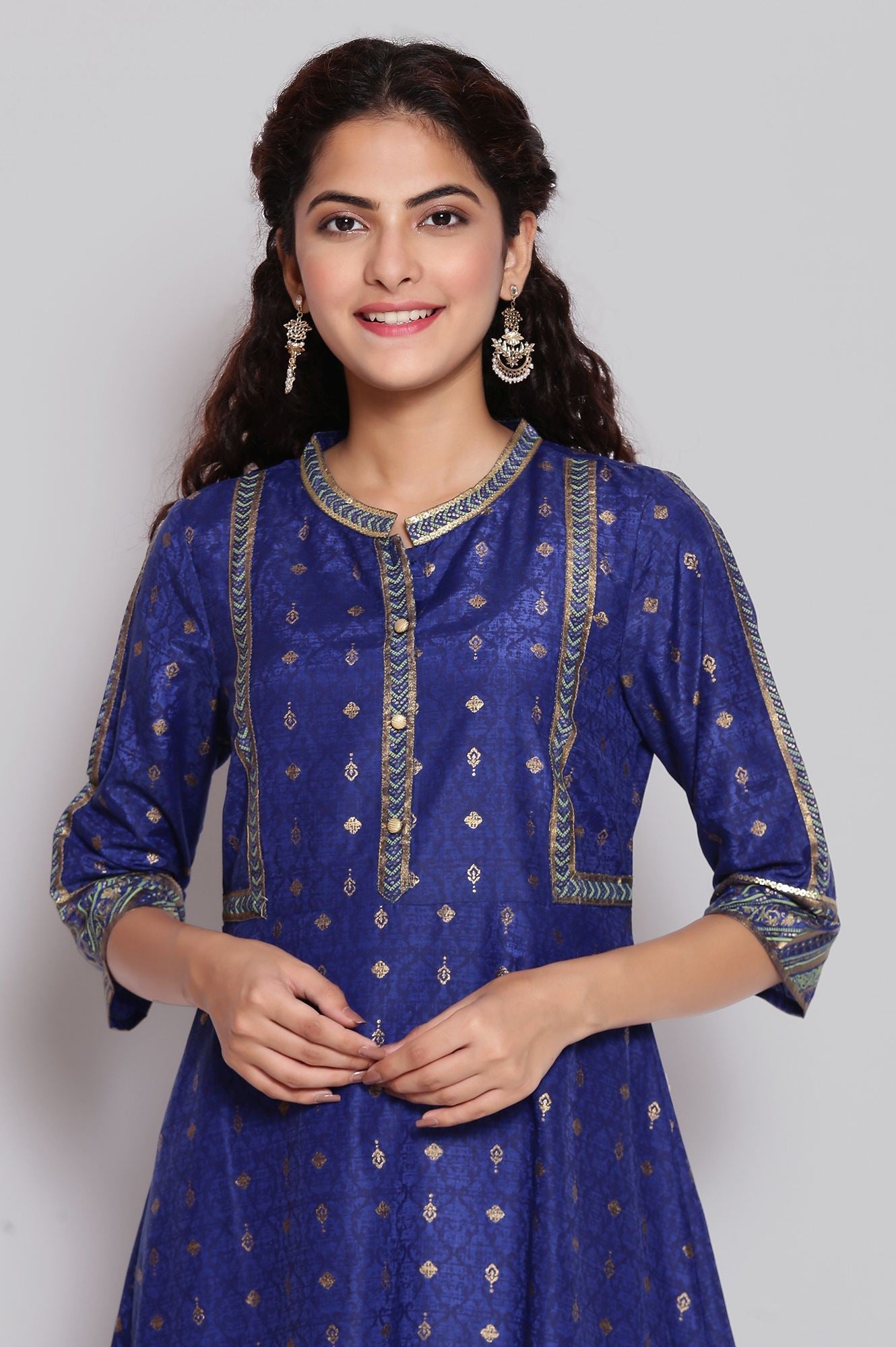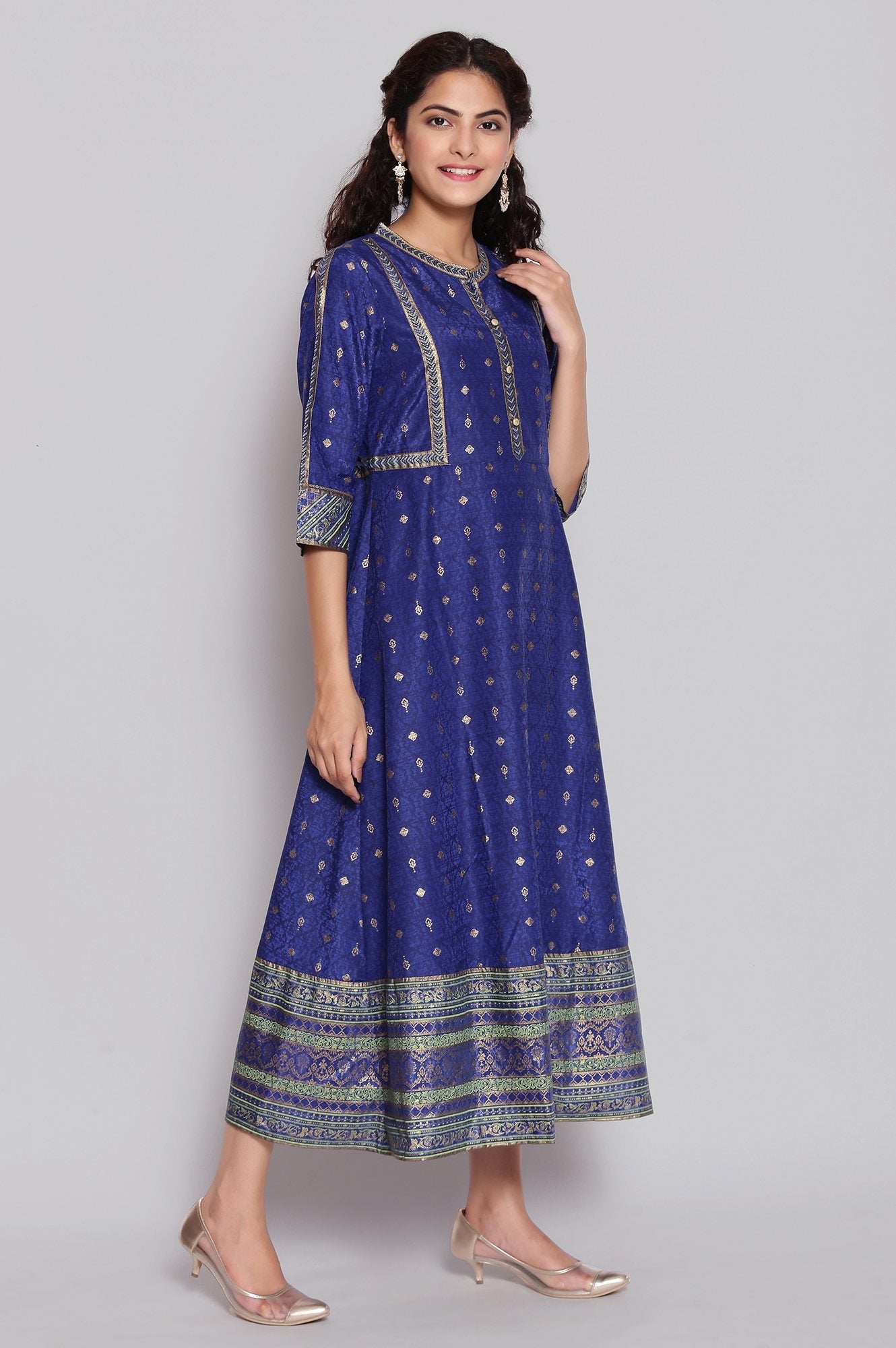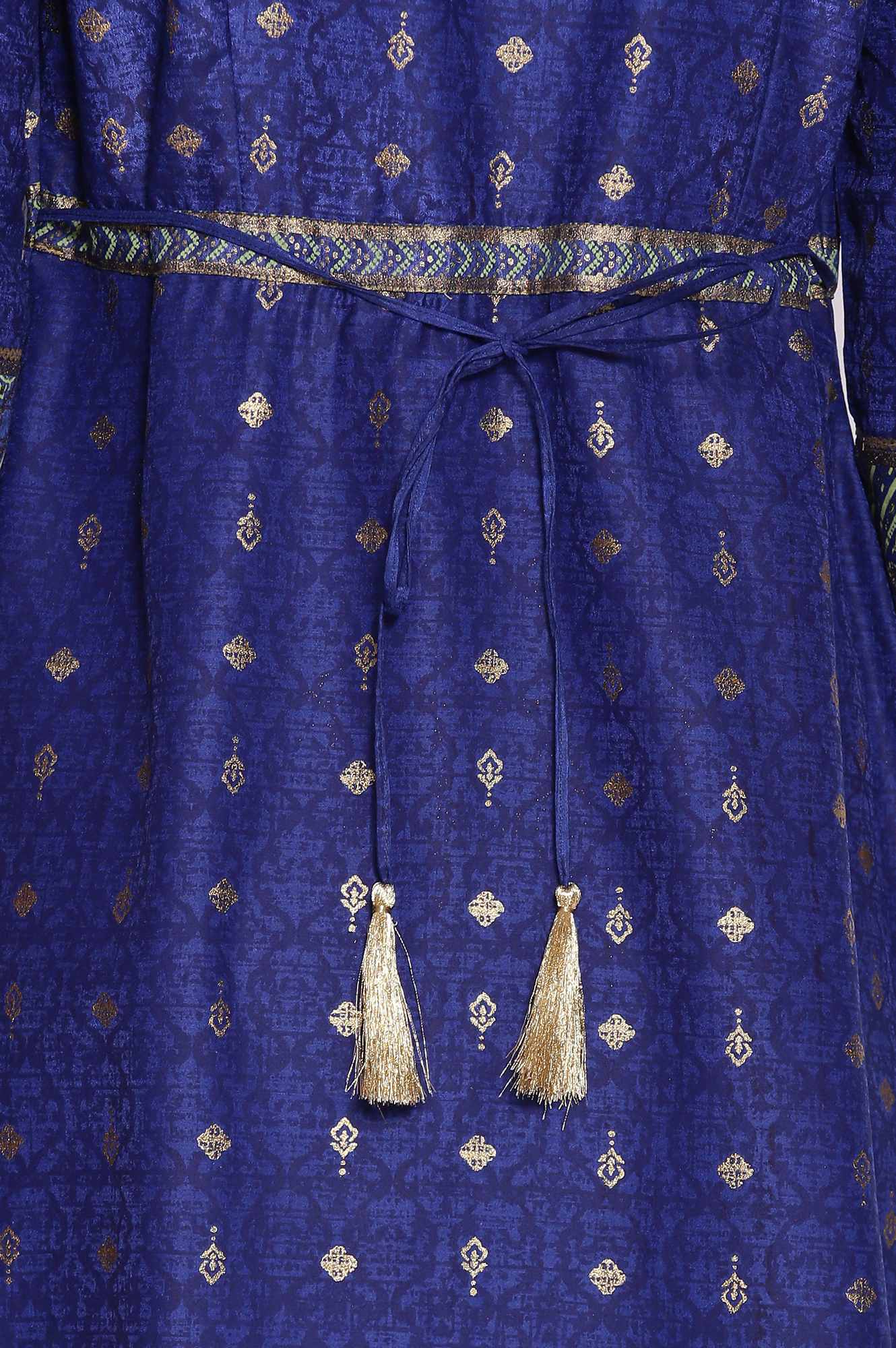 Light festive indian ethnic dress in sodalite blue colour is embellished with foil print and have border on hem and sleeves. It has mandarin collar with button closure.