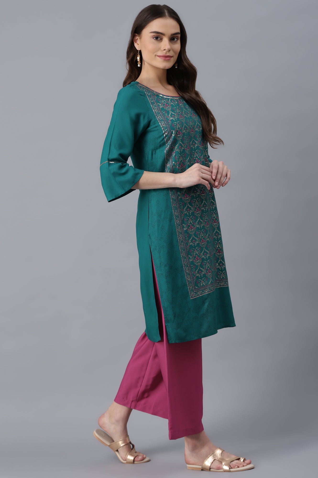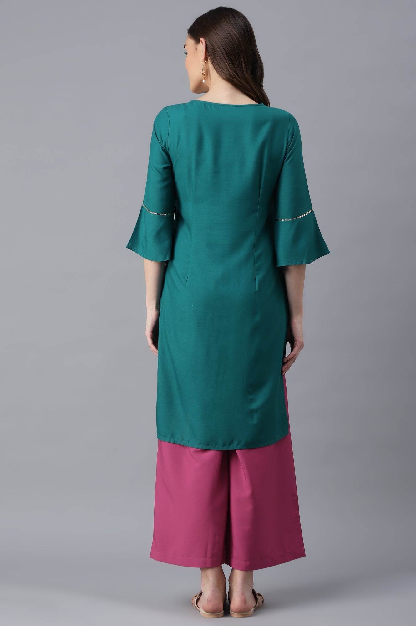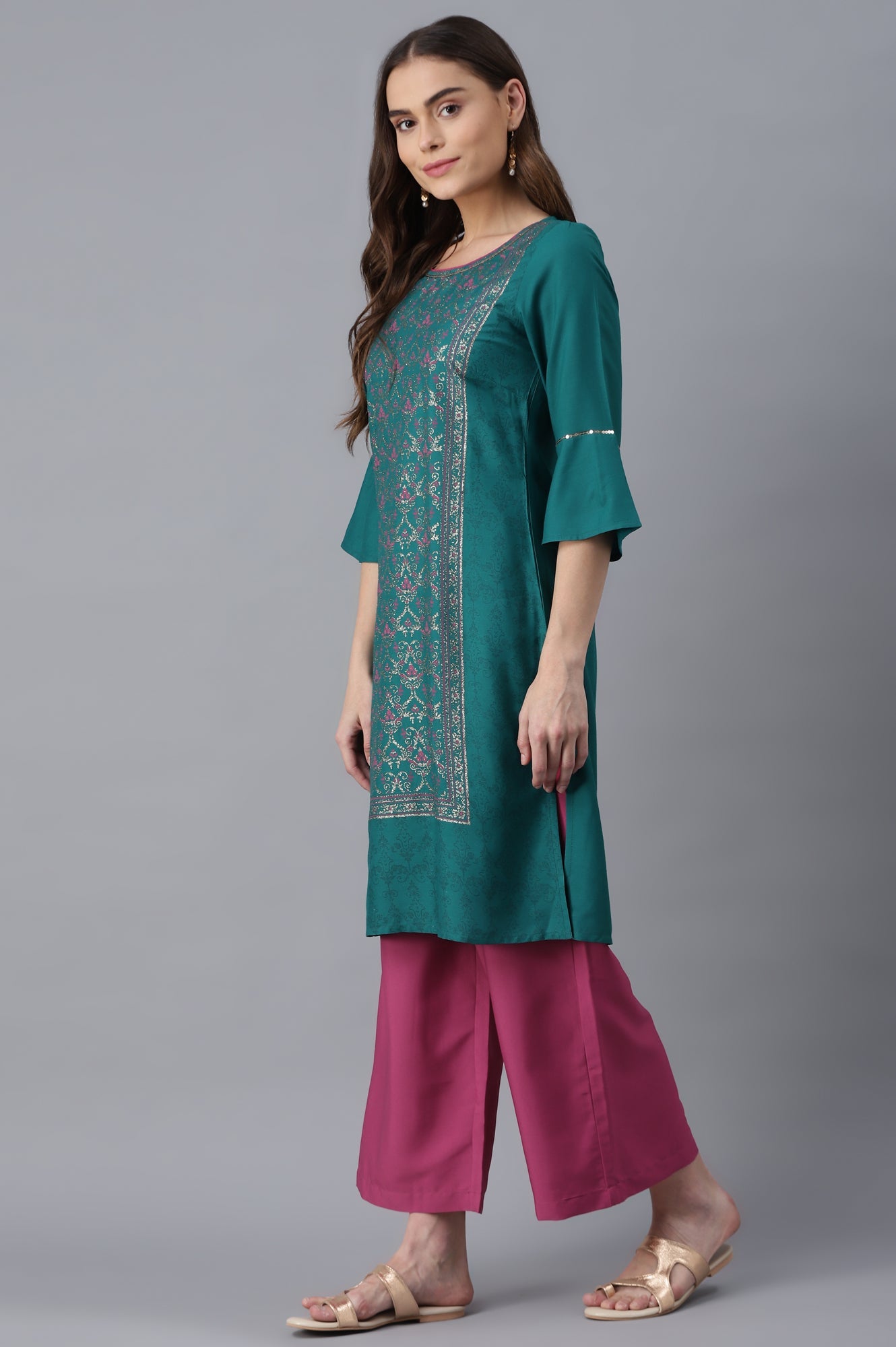 Nothing compares to a well-crafted fashion-forward silhouette. And this pair fall under this category. The kurta has floral glitter motifs and sequins. It is paired with pink solid palazzo in mid-rise and elasticated waistband.