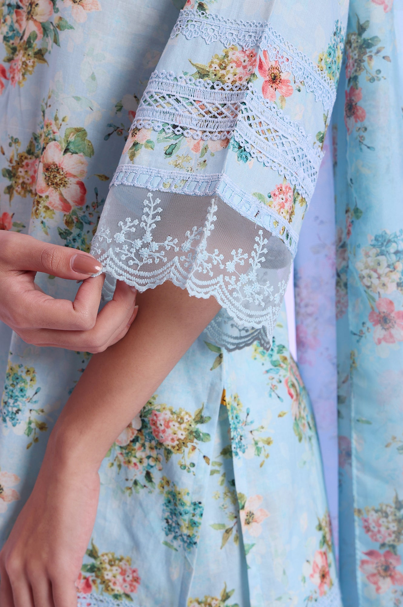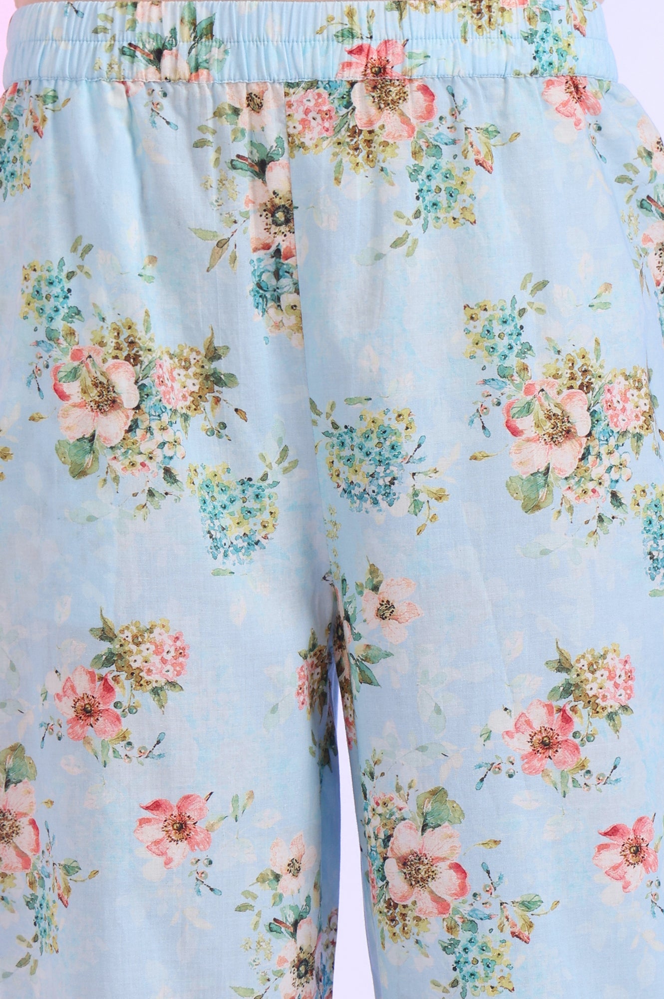 Experience the perfect blend of tradition and modernity with this fusion ethnic set from Aurelia. Crafted from superior 60S cambric, this sky blue ensemble features a straight kurta with palazzo pants and a dupatta. The kurta boasts a v-neck design and three-quarter sleeves, adorned with elegant digital prints and lace detailing. A stylish slit adds a contemporary touch to this casual wear. The polyester fabric ensures comfort and durability, while the woven construction technique guarantees quality. This hand-wash friendly set is perfect for women looking to make a statement in ethnic wear with a modern twist. Pair it with stylish sandals to complete the look, exuding effortless elegance. Versatile and timeless, this outfit is perfect for making a statement at any occasion, day or night.