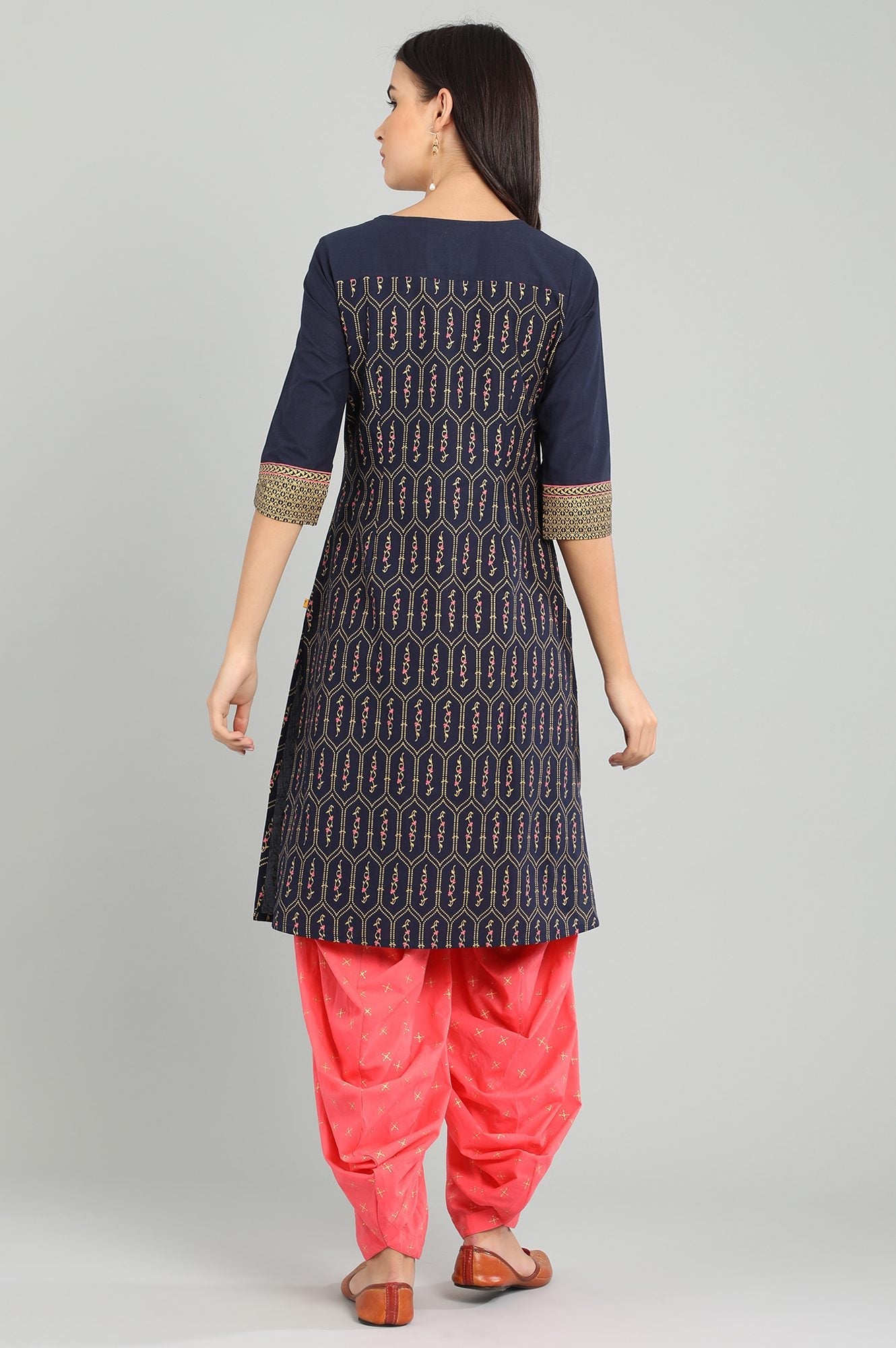 Grey round neck 3/4 sleeve kurta with printed detail and dori.