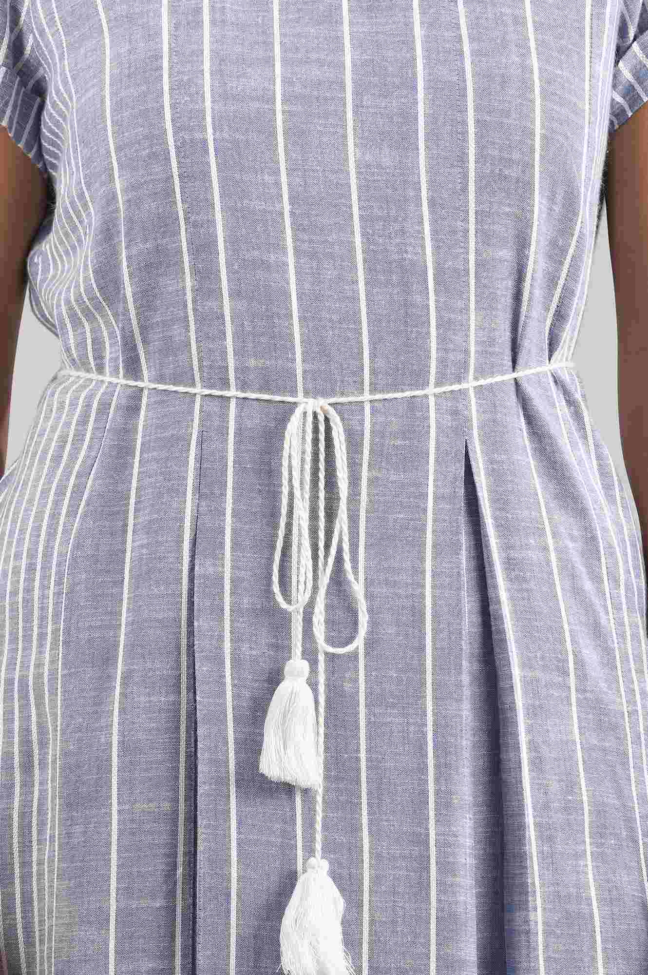 Blue A-line round neck Liva kurta with tie-up detail at waist and striped pattern all-over.