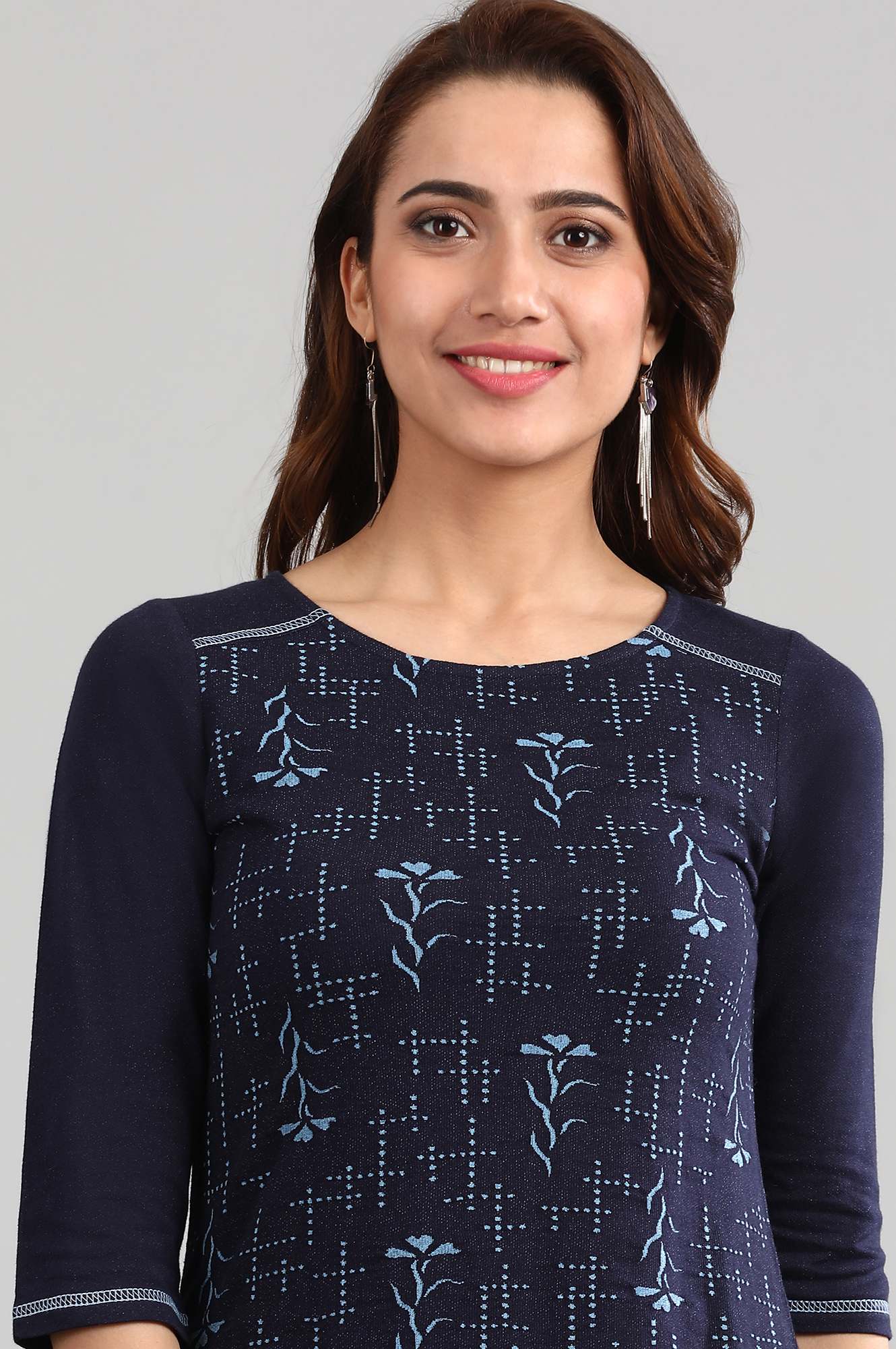Blue round neck yarn-dyed winter kurta with curved hemline.