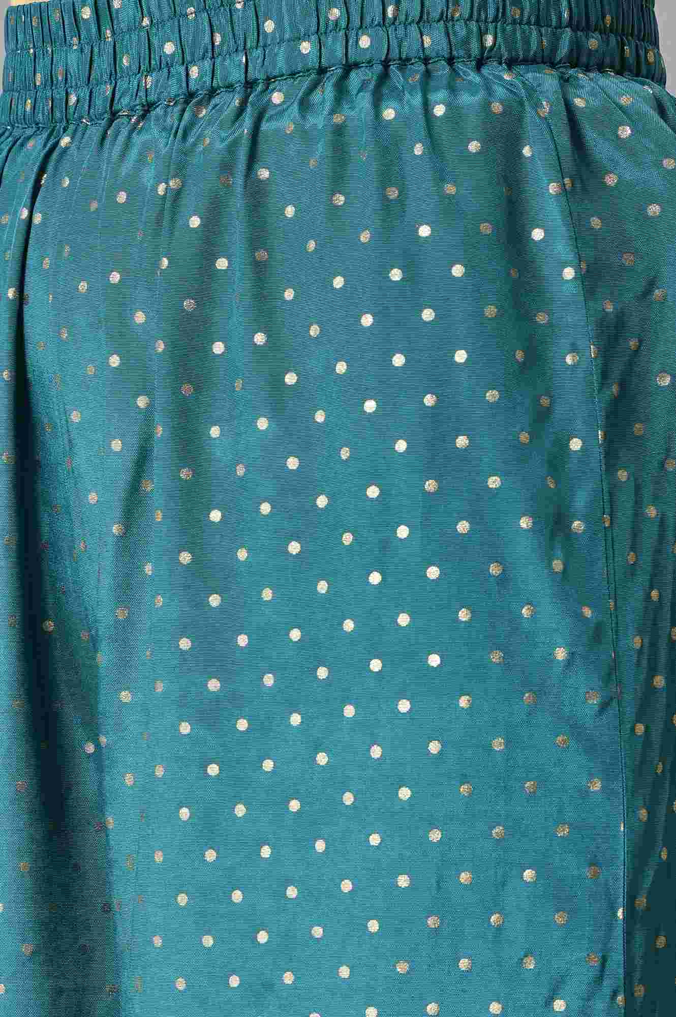 Slip into this two piece LIVA kurta and sharara set for comfort and elegance to stand out from the crowd. It comprises of an a heavily embroidered yoke on the kurta, where gold sequins and zari have been used to bring about that festive look. It is coupled with a printed polka dot sharara variation.