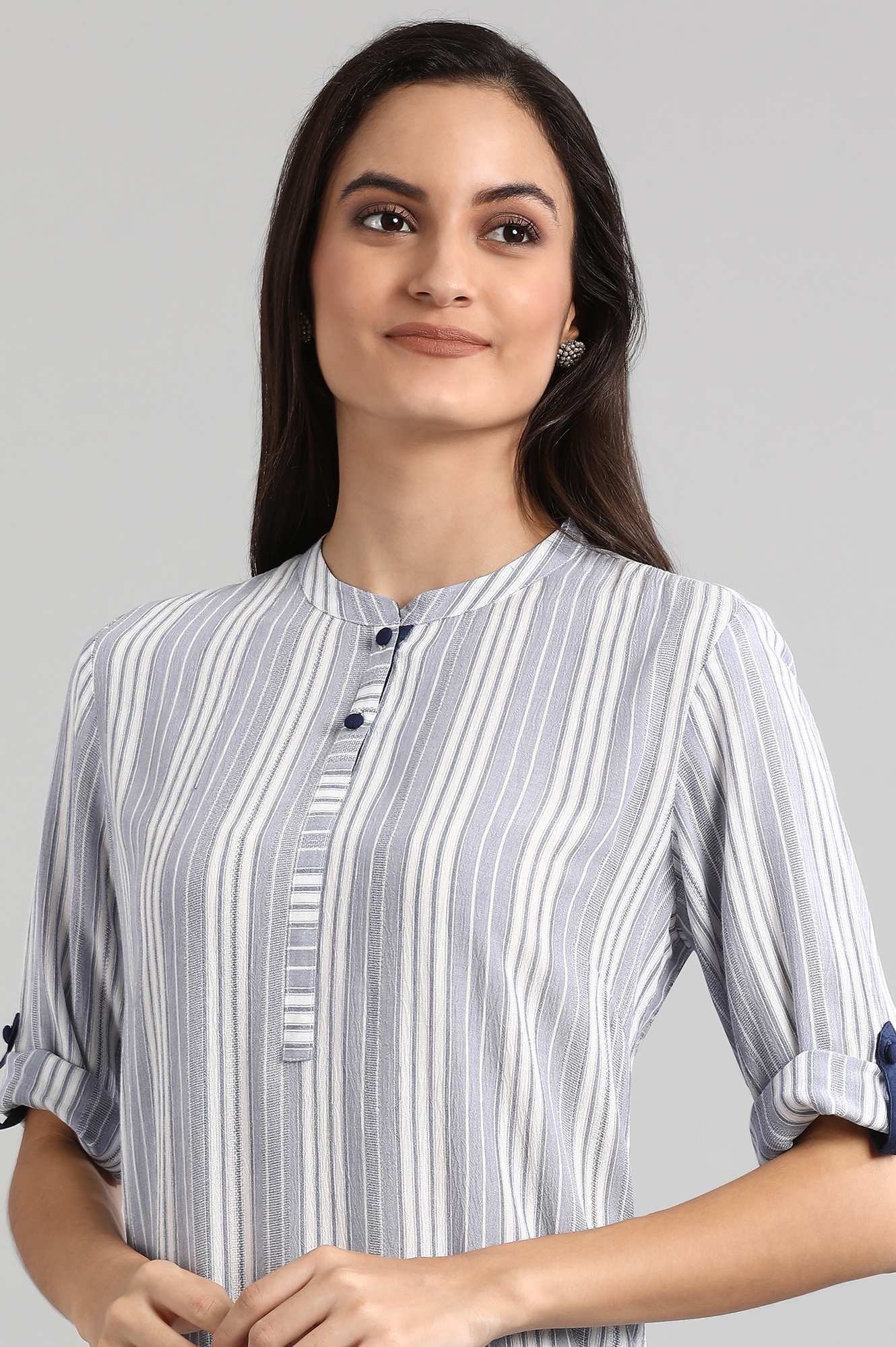 This Sky Blue Mandarin Neck 3/4 Sleeve kurta Has Button Placket With High-Low Hem And Side Slits.