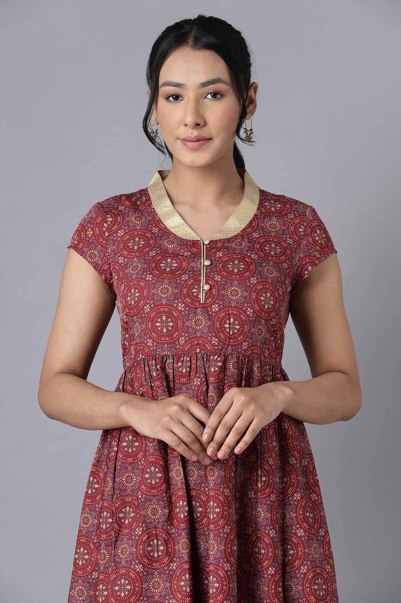 Doll up and swirl in fashion with this stunning maroon flared dress in gathered body details and ankle length. The dress crafted in american crepe and has floral print and gold mandarin collar with button closure.