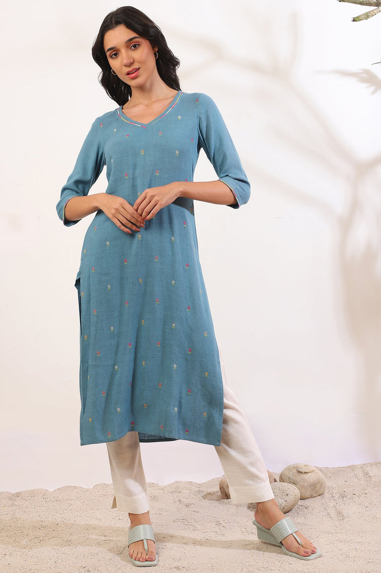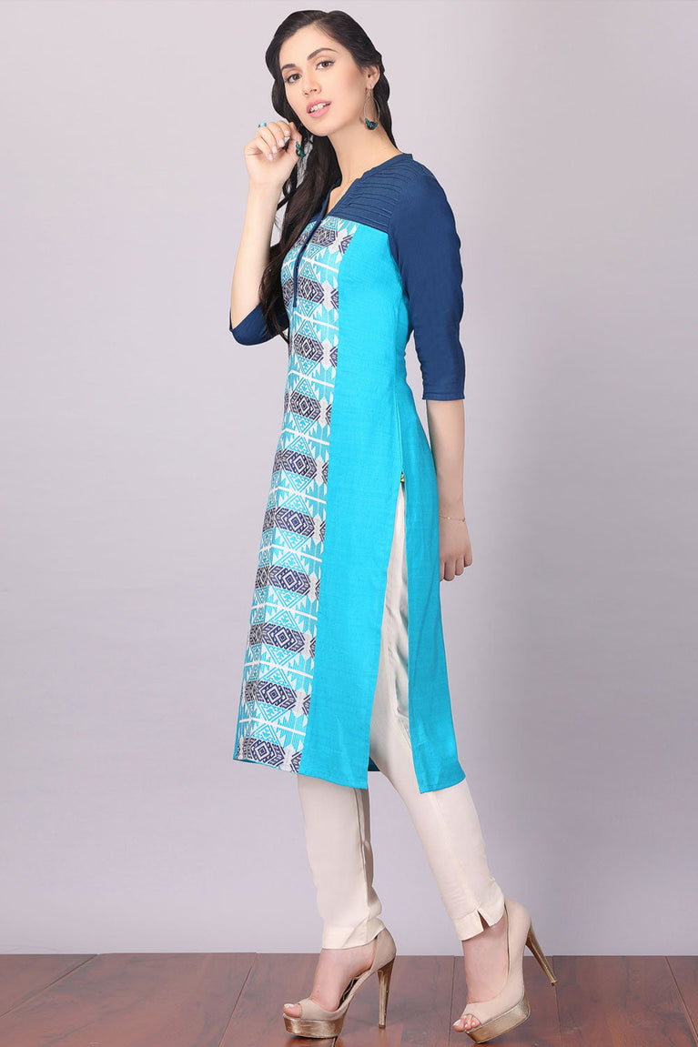 This blue mandarin neck 3/4 sleeve kurta has button placket on the front, printed detail and side slits.