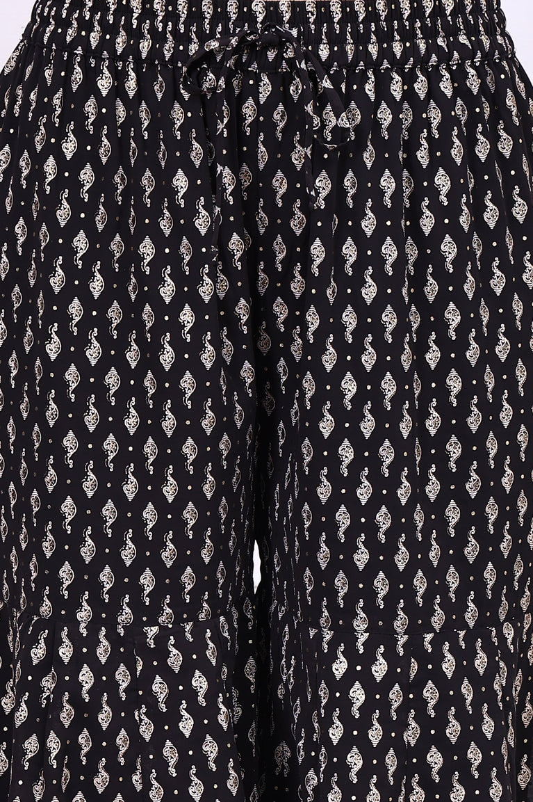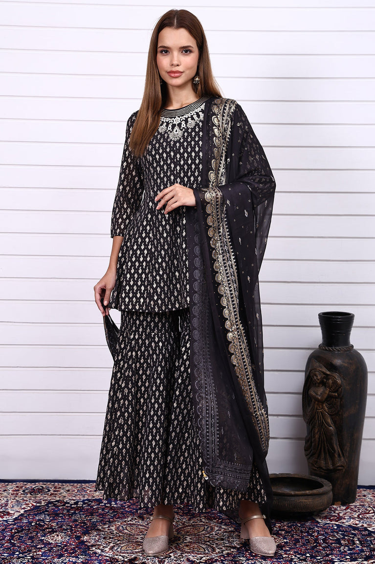 Black Ethnic Motifs Zari Embroidered Flared Kurta, Sharara and Dupatta Set