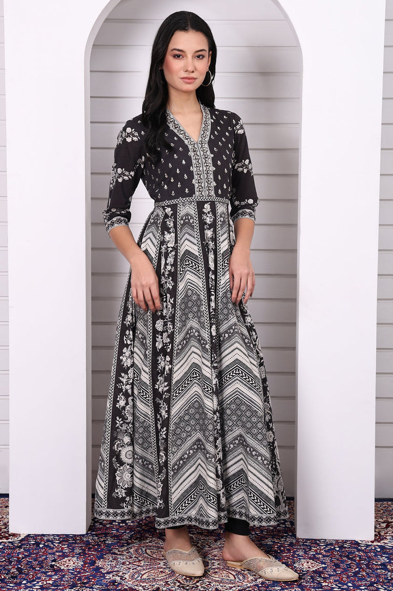 Black Abstract Printed Hand Work Flared Kurta, Leggings and Dupatta Set
