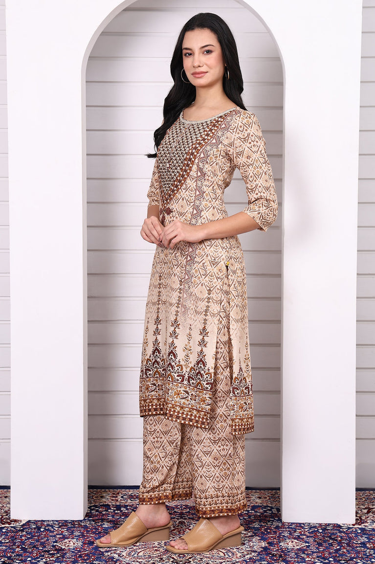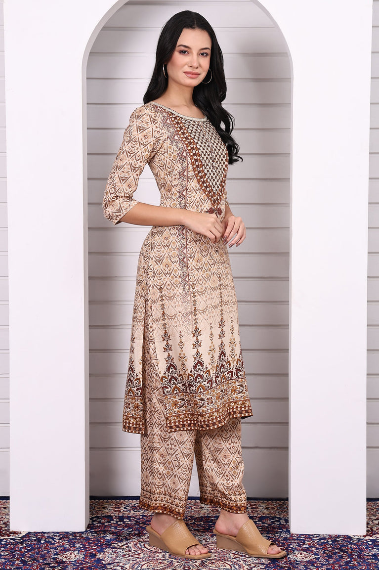 Beige Abstract Printed Beaded Cotton Straight Kurta, Palazzo and Dupatta Set