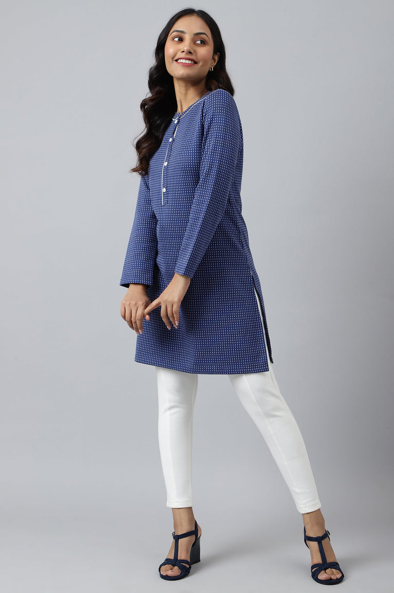 Running out of classics? Dont worry, we've got you covered. A short kurta that features a mandarin collar and placket detail with contrasting buttons on it. Pair it with our classic white yoga tights that has two roomy pockets that can keep your essentials.