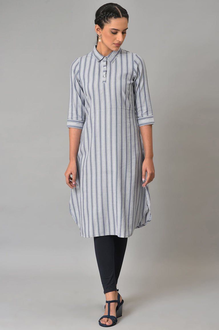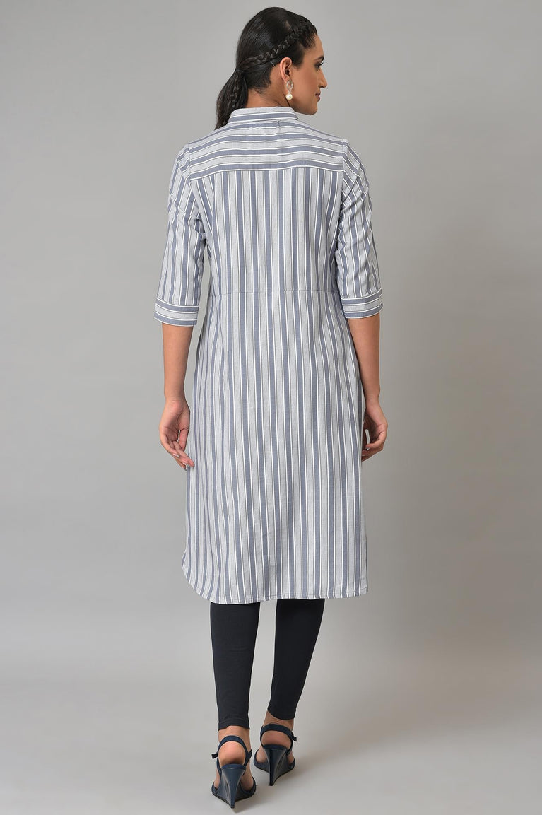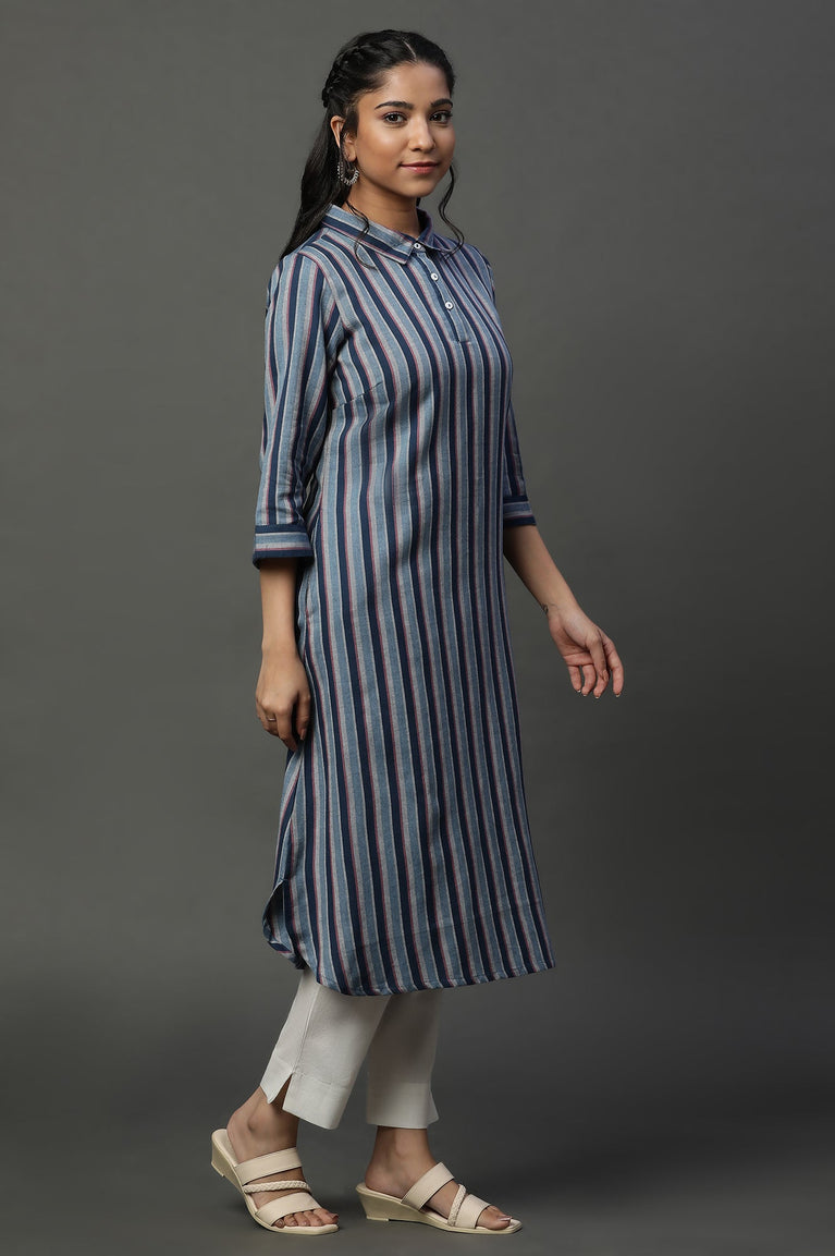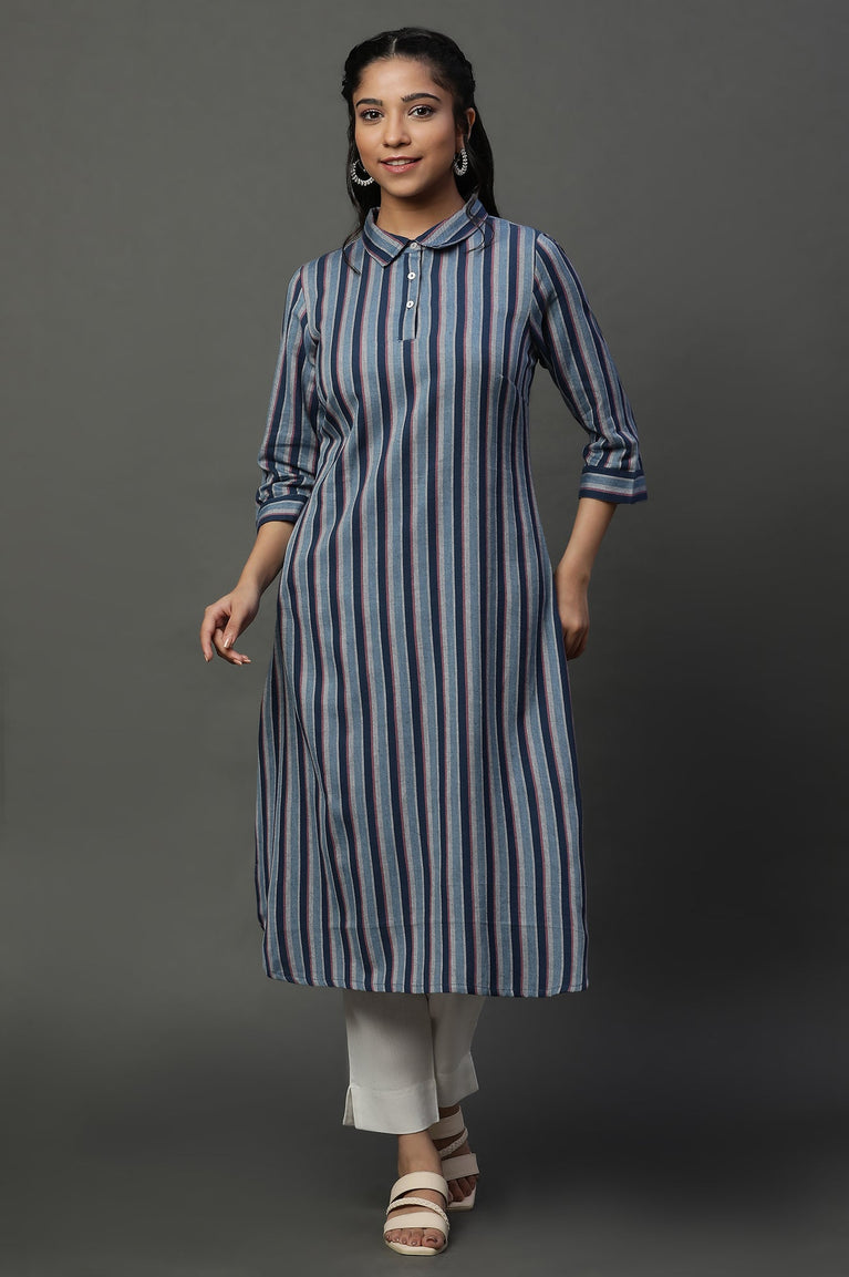 Get styled for a stylish and comfy travel look in this pretty blue striper kurta. The kurta has shirt collar and half button placket.