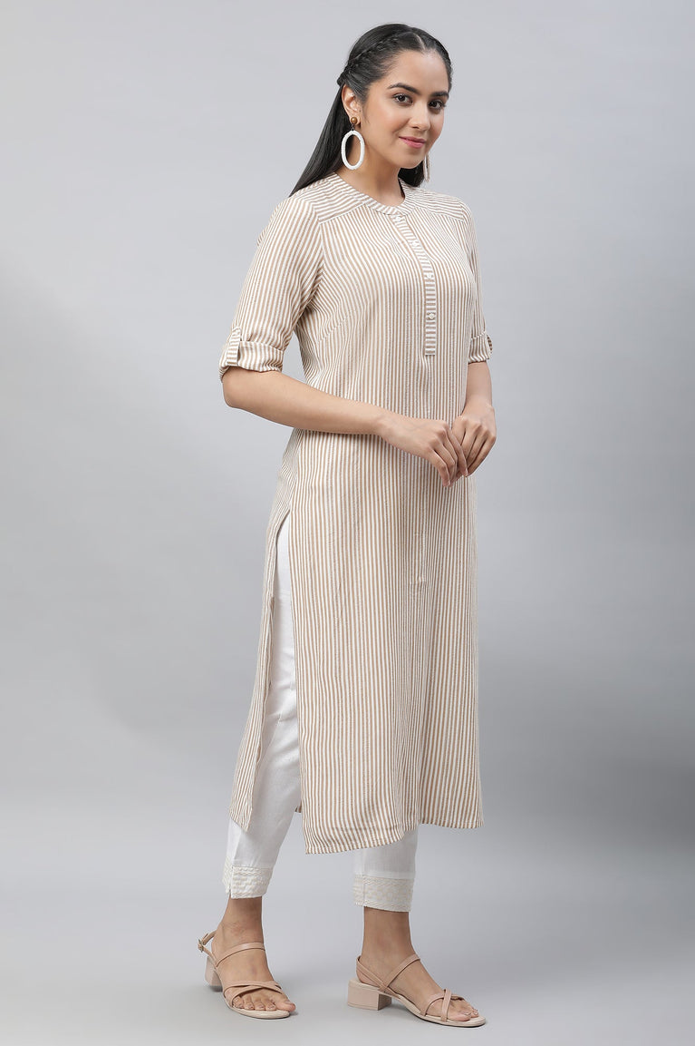 Get the stylish travel look in this stripe print short kurta in round neck and relaxed pintuck trouser pants.