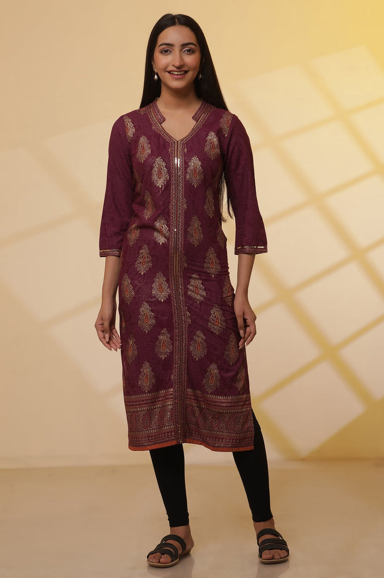 Plume blue printed straight kurta in band with V collar and regular three-quarter sleeves.