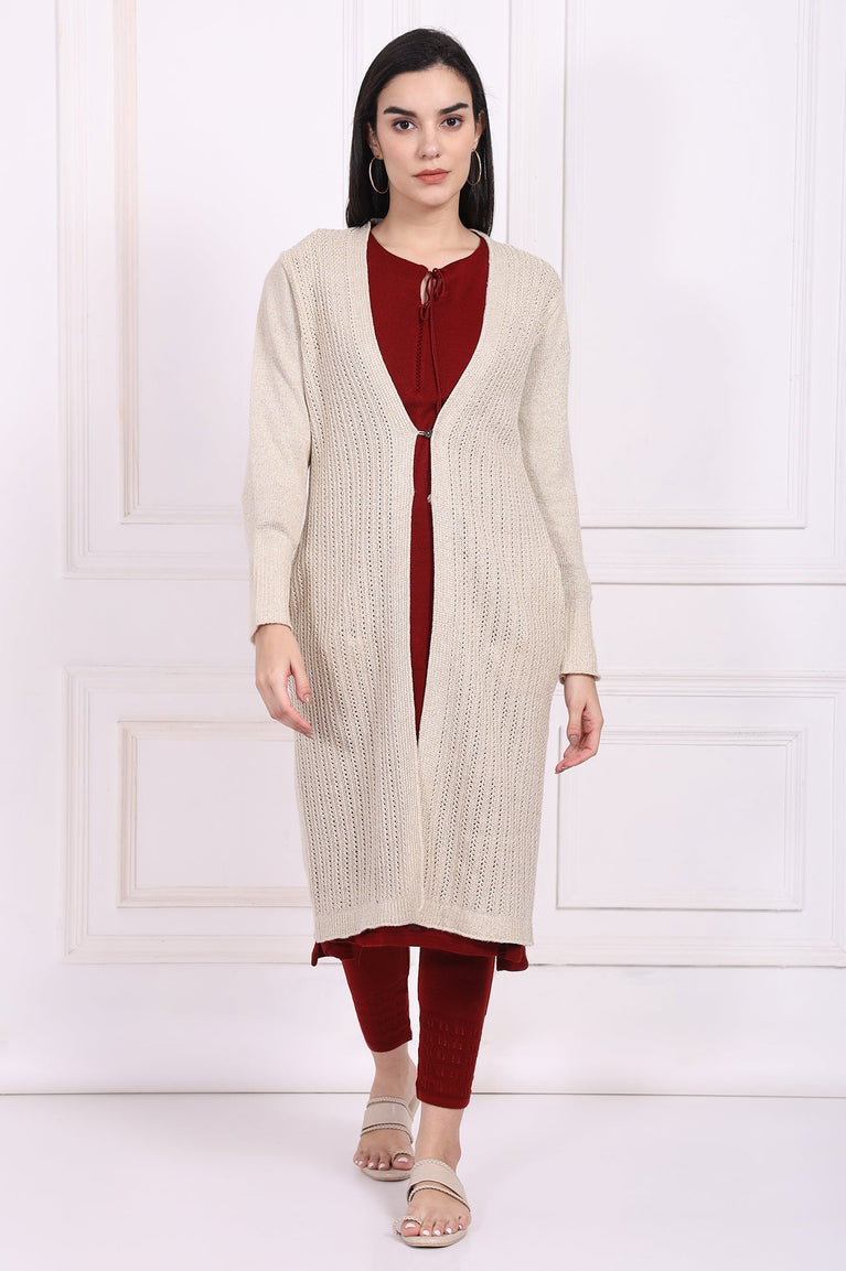 A true masterpiece of relaxed tailoring, this sweater for women is the layer you'll reach for time and again. It's rendered in a gorgeous soft beige, subtly illuminated with Lurex threads for a hint of understated glamour. The longline silhouette is designed to flatter, draping in a straight, elegant line that moves with you. An open-front design makes it a versatile companion to everything from dresses to denim, while the single tie-front closure, complete with delightful tassels, provides a touch of artisanal detail. The all-over textured knit is both visually interesting and wonderfully tactile. This long beige cardigan features full-length sleeves that end in a clean hem, mirroring the straight hemline of the body for a cohesive, polished look. There is no distinct yoke design, allowing the textured pattern to flow uninterrupted. Two generous patch pockets are seamlessly integrated into the front, adding a practical element to its chic design. The fabric is fully opaque, offering complete coverage and peace of mind. As an essential open front sweater with pockets, it’s a perfect piece for navigating changing seasons with style and grace. You'll find it's the perfect finishing touch for any ensemble.