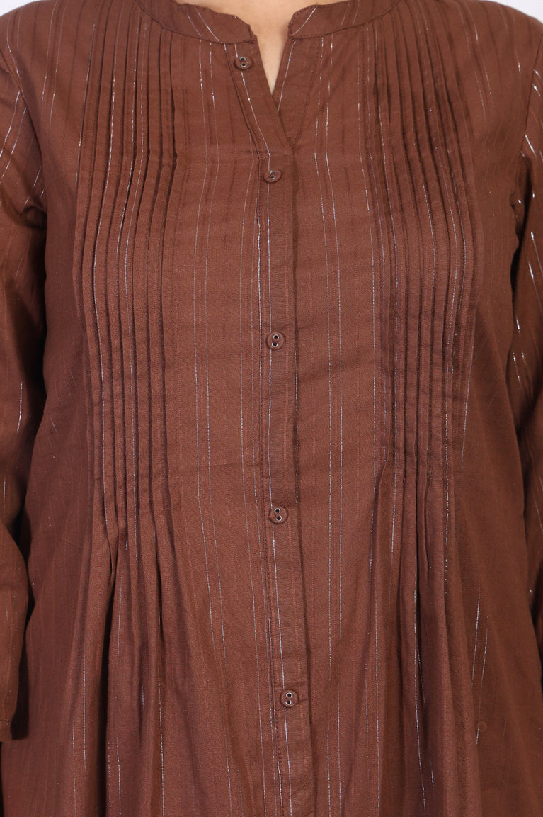 Subtle sophistication in every thread, this kurta set for women is a masterclass in understated elegance. The ensemble, designed in a rich shade of cocoa Brown, presents a beautifully tailored A-line kurta that glides over the frame, offering a silhouette that’s both flattering and supremely comfortable. Delicate pintucks create a refined texture across the yoke, leading down to a classic full button placket that adds a touch of structure. Framed by a sharp Mandarin collar, the design speaks to a modern aesthetic rooted in classic style. The fabric is brought to life with fine, shimmering Lurex stripes that catch the light with every movement, adding a quiet glamour to this stunning ethnic co-ord set. Its three-quarter sleeves are styled with a gentle flare, echoing the kurta’s graceful shape and adding a contemporary finish. This brown striped kurta palazzo set is crafted from a breathable and opaque cotton blend, ensuring you stay poised and comfortable all day long. The A-line kurta, finished with a clean, straight hemline, pairs perfectly with the matching striped wide-leg palazzo pants included in the pack. You’ll find this two-piece ensemble, an impeccable pintuck yoke kurta set, becomes an effortless choice for the modern woman seeking a polished look for her workwear or elegant day-formal wardrobe.