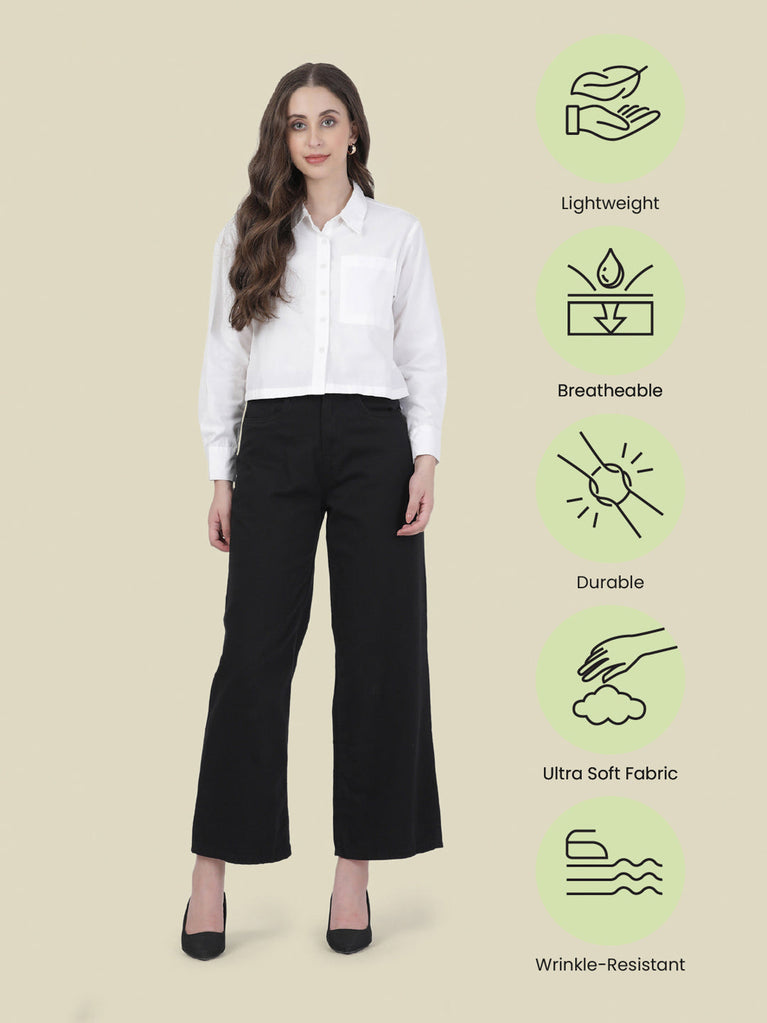 Wear a crisp white button down or a tee our Solid Black Ponte Pants are the perfect pair to team it up with. Made from stretch viscose, nylon & elastane fabric, it has elasticised waistband, slant pockest & slim fit.