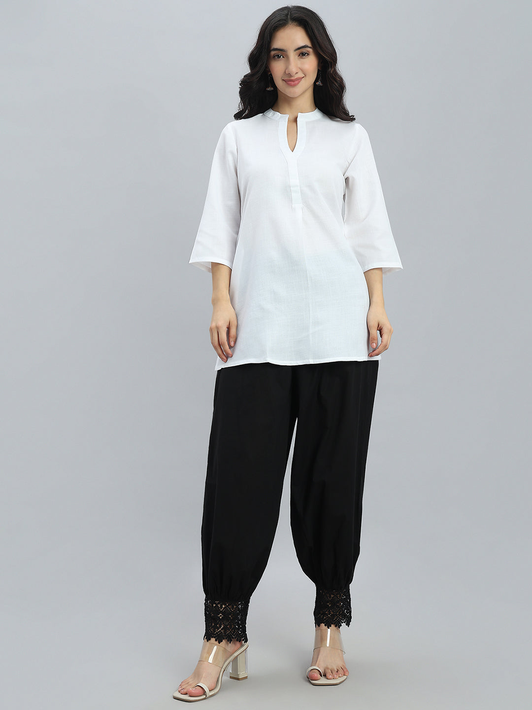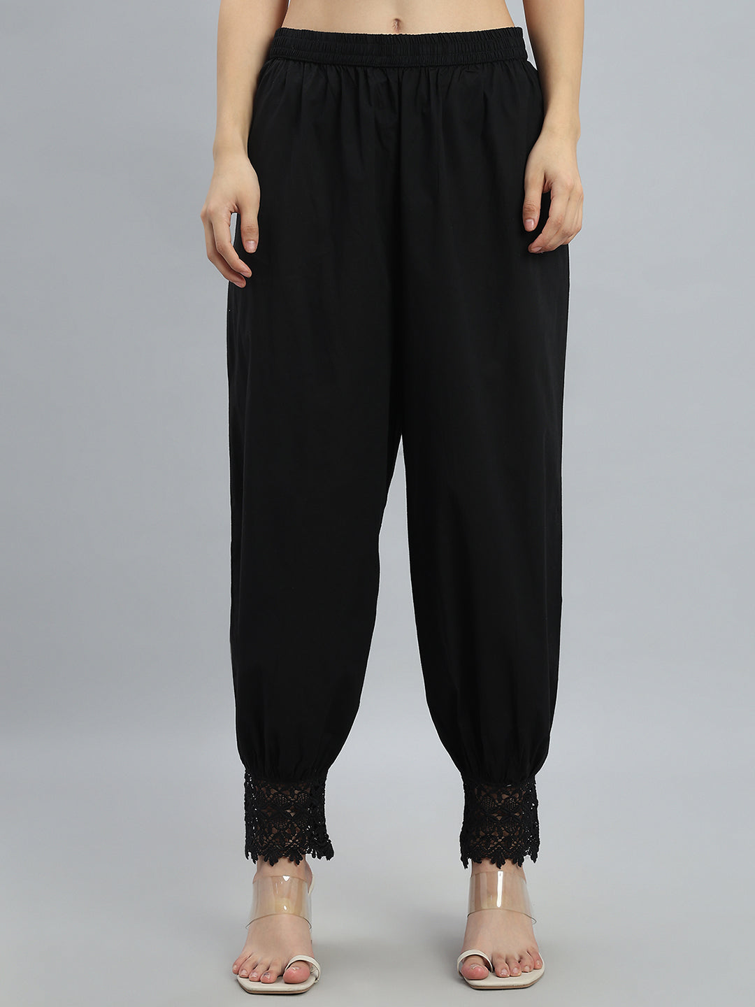 Elevate your ethnic wardrobe with this elegant Black Lace Salwar, crafted from 100% pure cotton for breathable, all-day comfort. Designed in a solid finish with a relaxed fit, it features a comfortable mid-rise waist and an ankle-length silhouette. The highlight of this salwar is the delicate embroidery at the hem, enhanced with lace detailing for a refined ethnic touch. Finished with a soft elastic waistband, it pairs effortlessly with kurtas and tunics for everyday and festive wear.