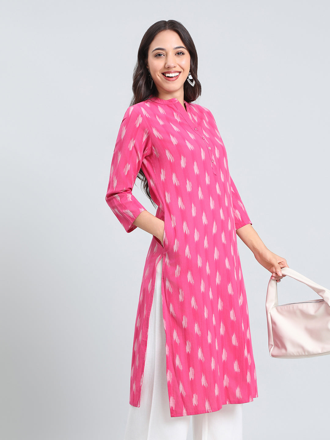 Crafted in pure cotton with an authentic Ikat weave, this straight kurta features a Mandarin collar, button placket, ¾ sleeves, side pockets & deep slits. Effortlessly elegant.