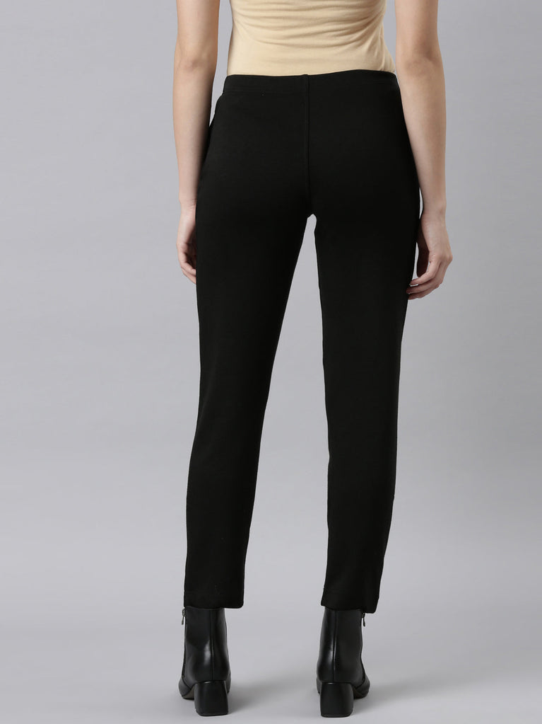 Wear a crisp white button down or a tee our Solid Black Ponte Pants are the perfect pair to team it up with. Made from stretch viscose, nylon & elastane fabric, it has elasticised waistband, slant pockest & slim fit.