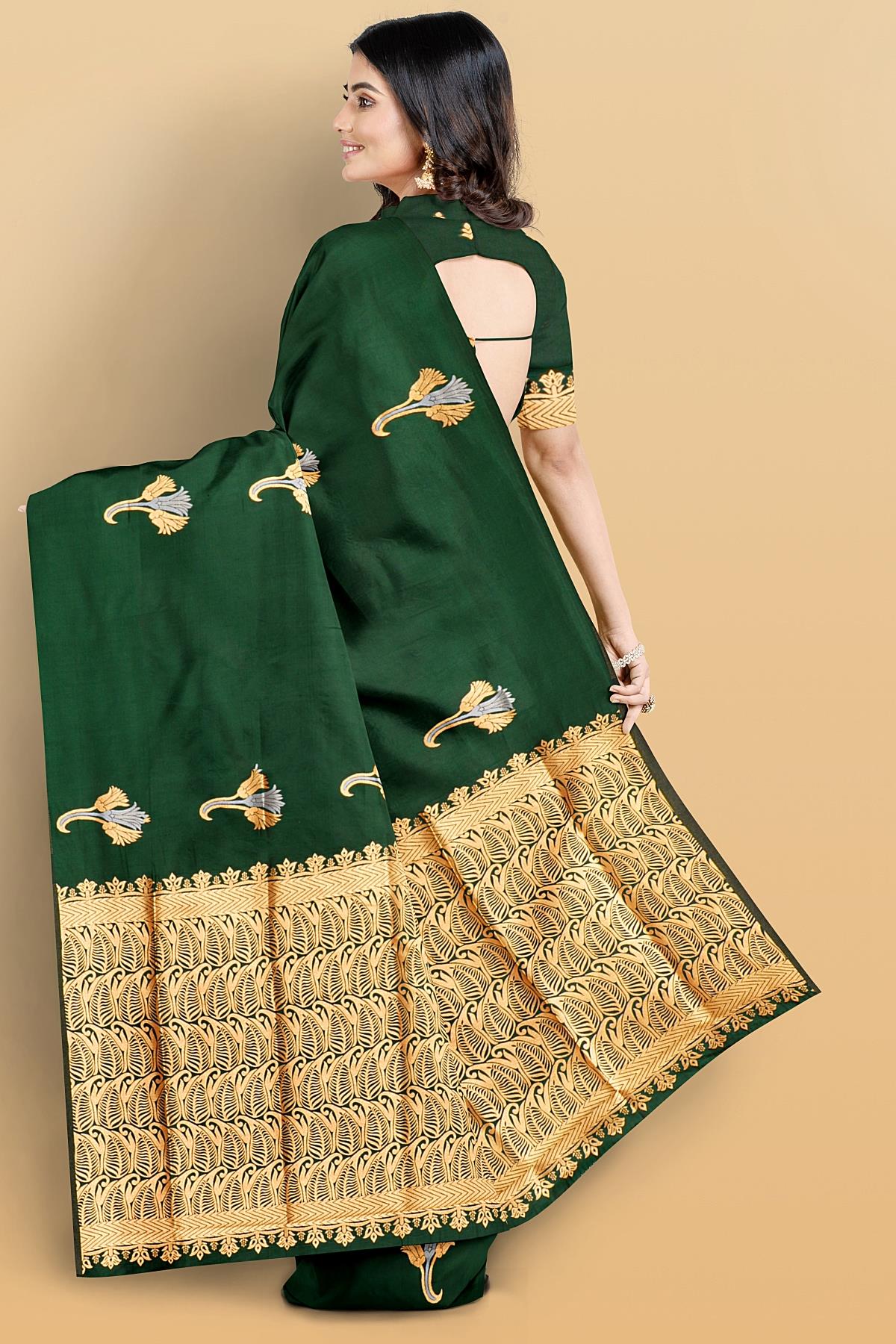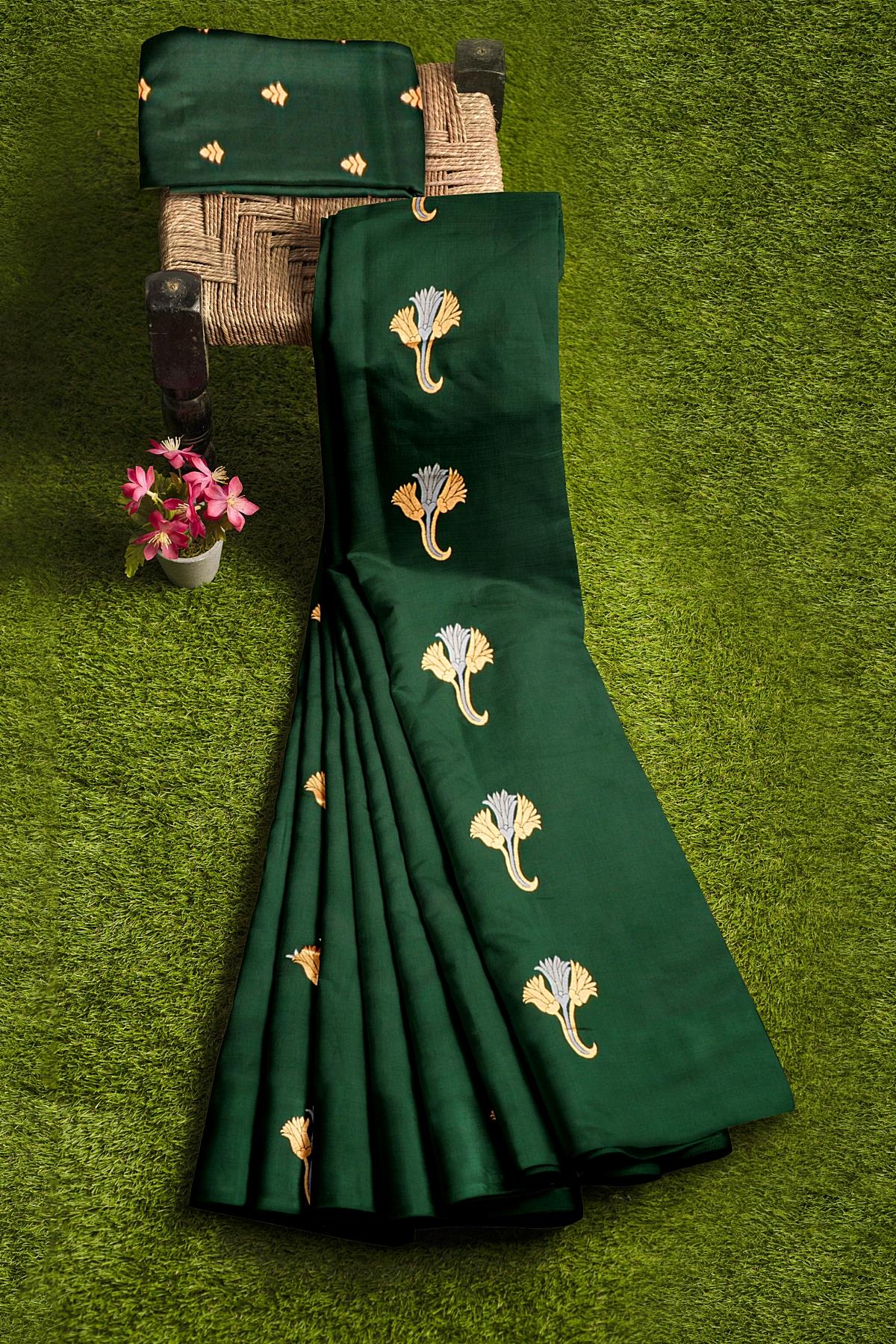 Latest GREEN BUTTIS SILK BLEND Saree with SELF ZARI border. This saree comes with PLAIN WITH BORDER SILK BLEND blouse.