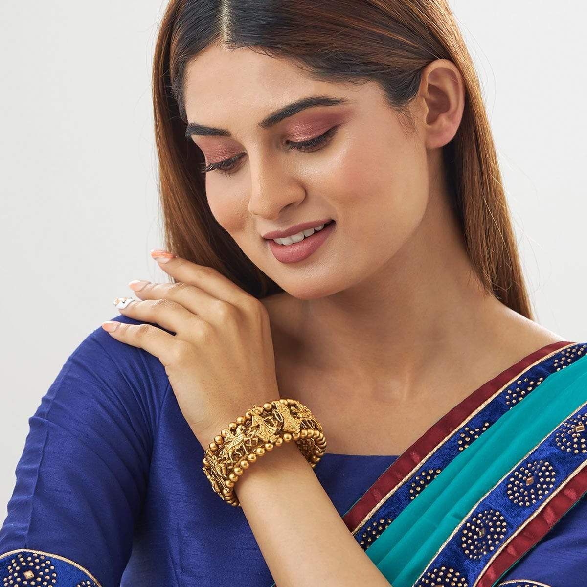 Embrace ethnicity with this beautiful, antique bangle from Kushal’s Antique Jewellery Collection. Its luxe gold polish makes it one-of-a-kind. Crafted from a copper alloy base, it features a secure locking system. Style it with a banarasi saree, kolhapuris and a sleek bun to exude your authentic, desi vibe.