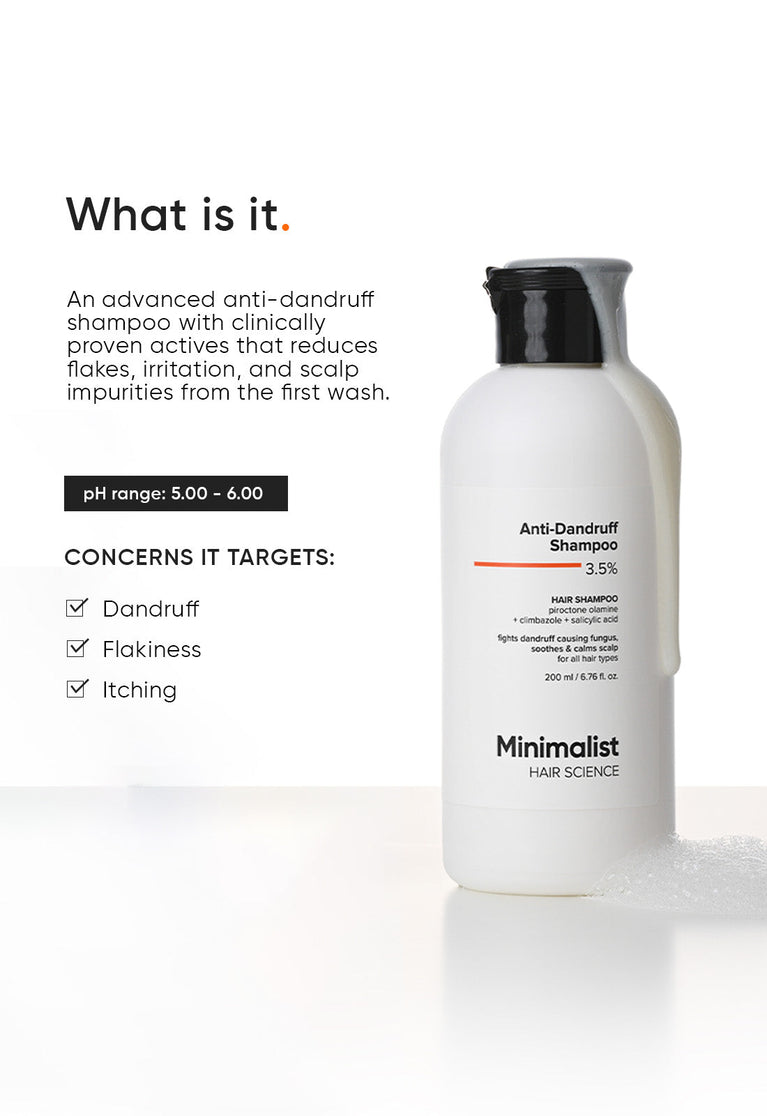 An advanced anti-dandruff shampoo formulated with clinically proven blend of PiroctoneOlamine, Climbazole, and Salicylic Acid to effectively target dandruff-causing fungi and scalp buildup. Experience visible results from the first wash, as this potent yet gentle cleanser works to eliminate flakes, reduce irritation, and restore scalp balance. Designed for long-term dandruff control, it soothes the scalp while maintaining the optimal hydration, leaving your hair refreshed, clean and protected against recurring dandruff.
