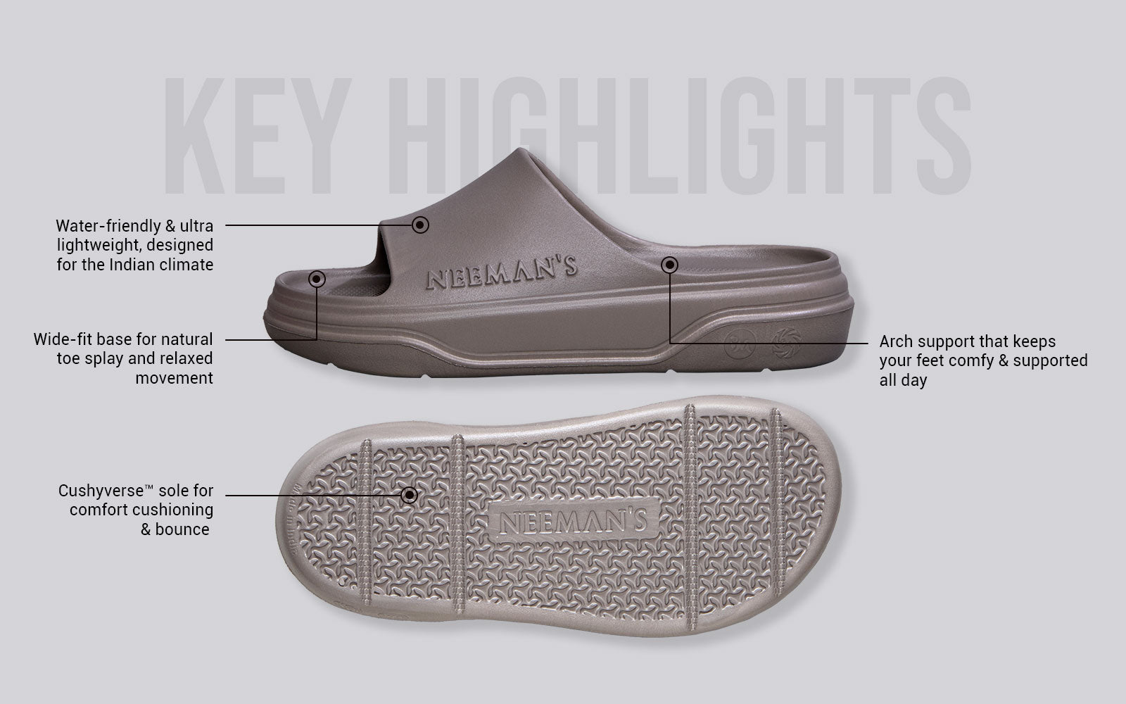 Presenting the Cushers - Crafted for your feet's love for cushioning! With our uniquely engineered CushyVerse™ technology, the Cushers Slides bring bounce, support and comfort extending from mid-foot to heels to your sole.