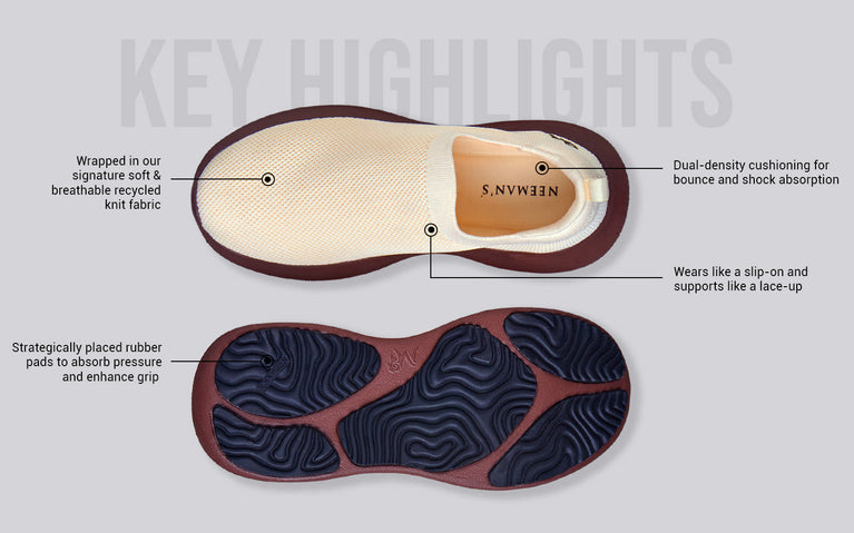 Still snoozing your morning alarms? Dragging yourself to walks like it’s an early morning meeting? It’s not you; it’s your shoes. Meet the Begin Walk ‘Breeze’. With a breathable knit upper, energy-returning insole, responsive cushioning & compression midsole, and a pressure-mapped outsole, these shoes offer you the most comfortable walking experience, all while managing the stiffness and stress on your joints & muscles.