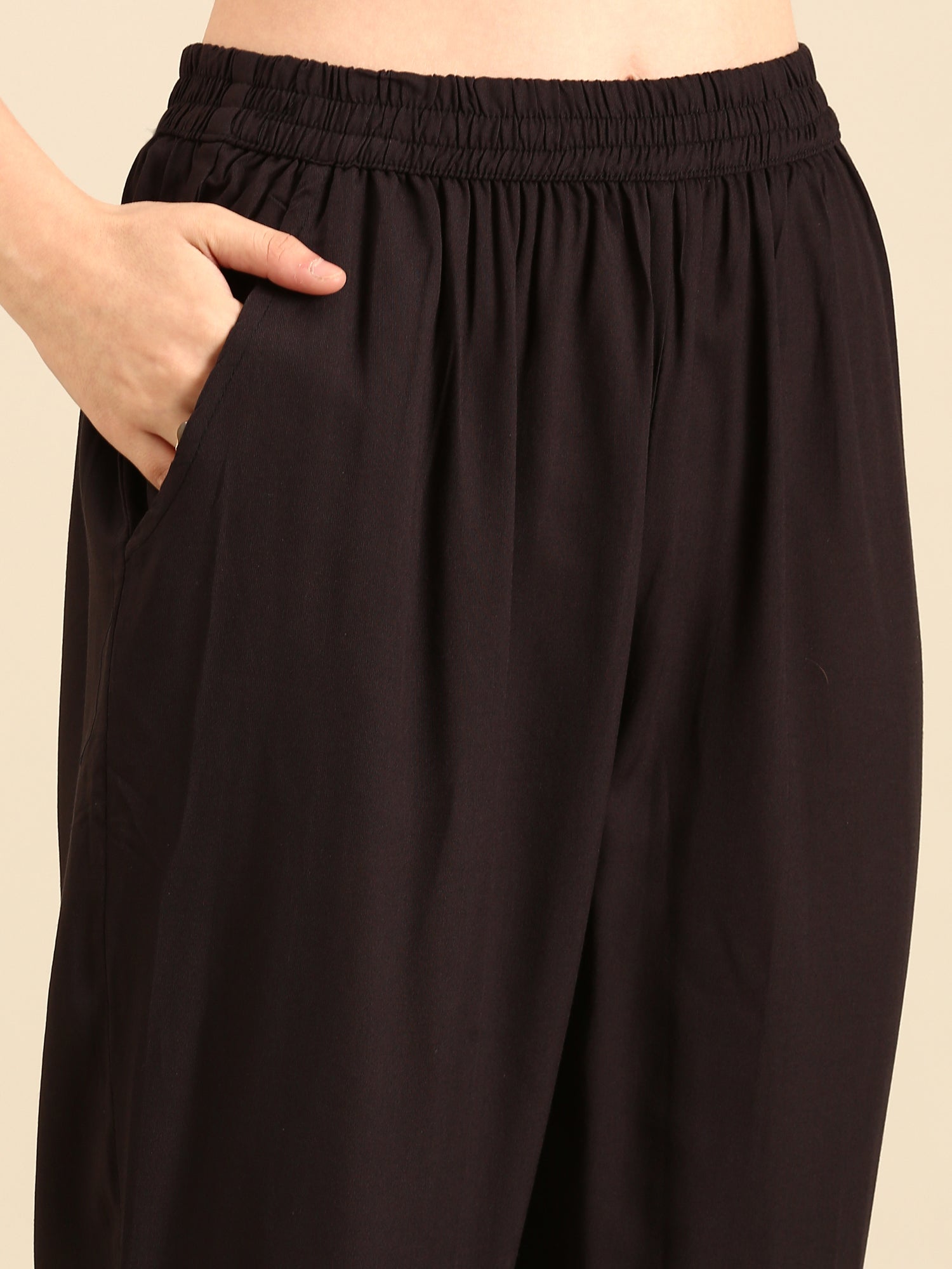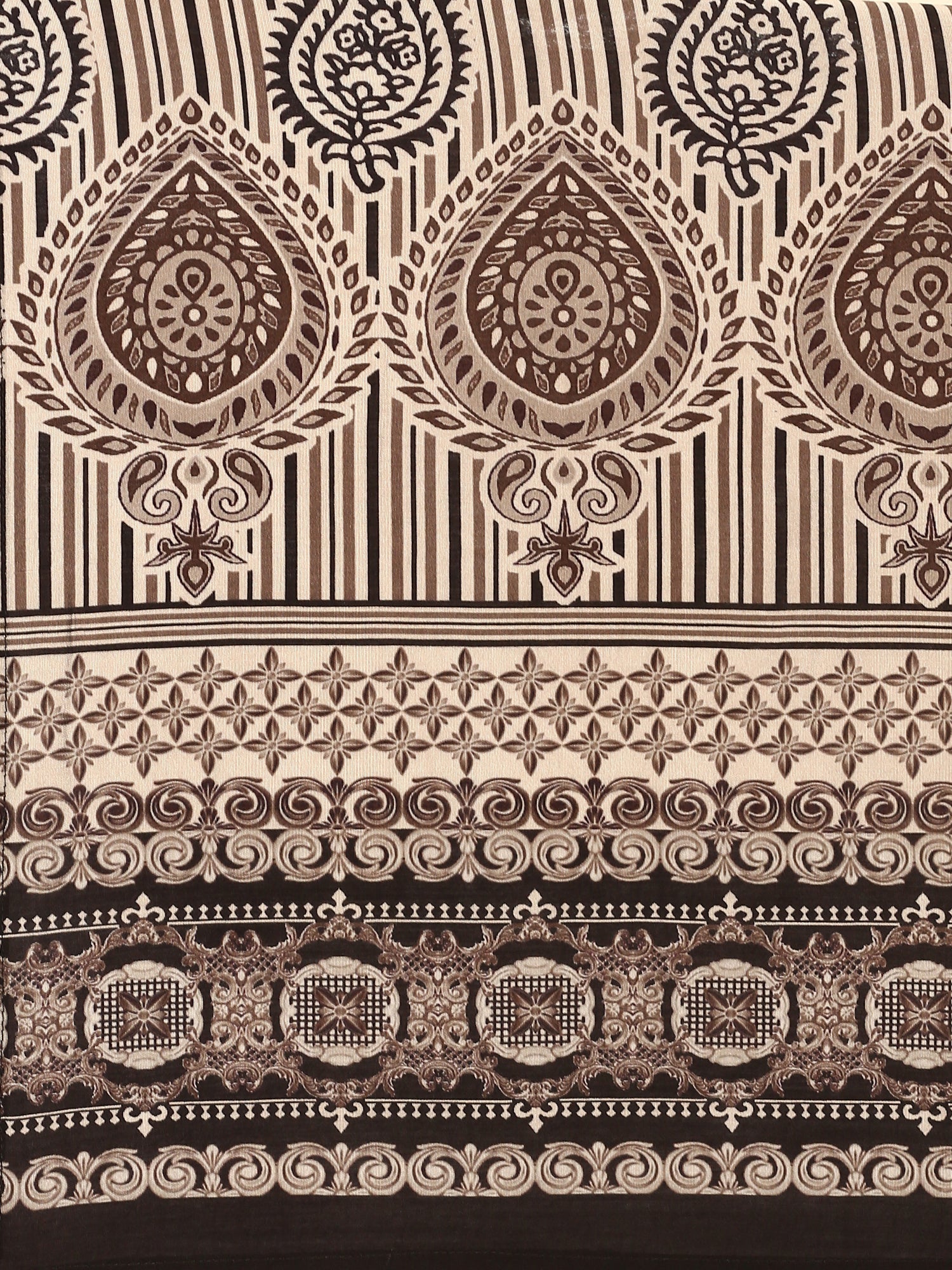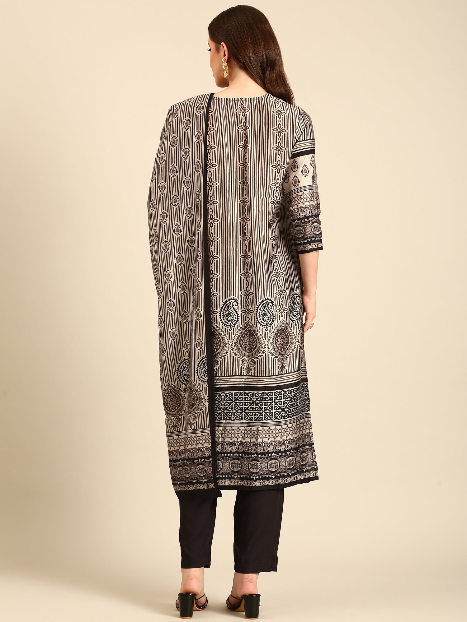 Elevate your wardrobe with this beige and black three-piece suit set featuring an exquisite all-over black and white crepe fabric print. Hand-embellished with shimmering sequins and delicate mirror work, it adds a touch of timeless elegance and craftsmanship. Perfect for special occasions, this suit offers a unique blend of traditional artistry and contemporary style to make you stand out effortlessly.