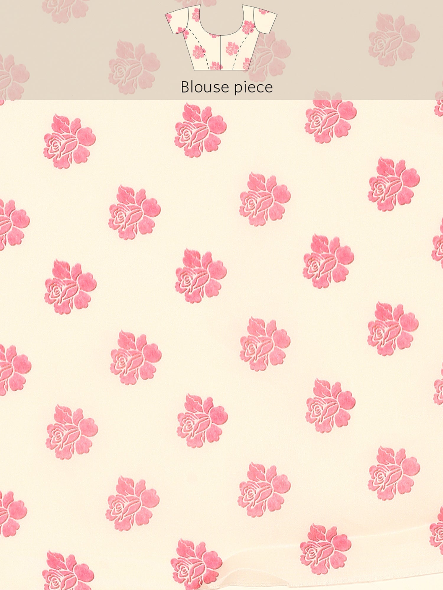 Cream satin saree with pink printed motifs with swarovski embroidery