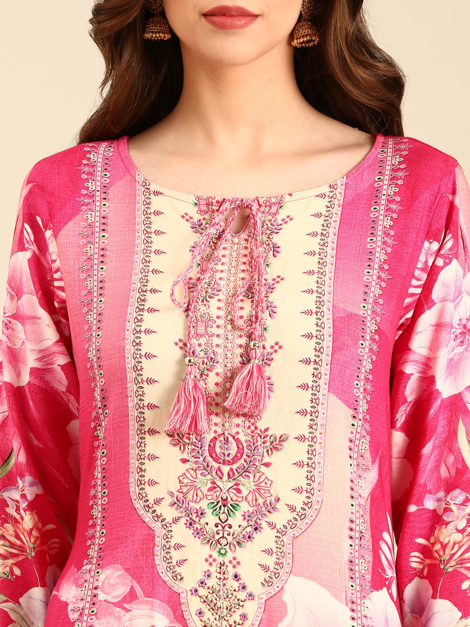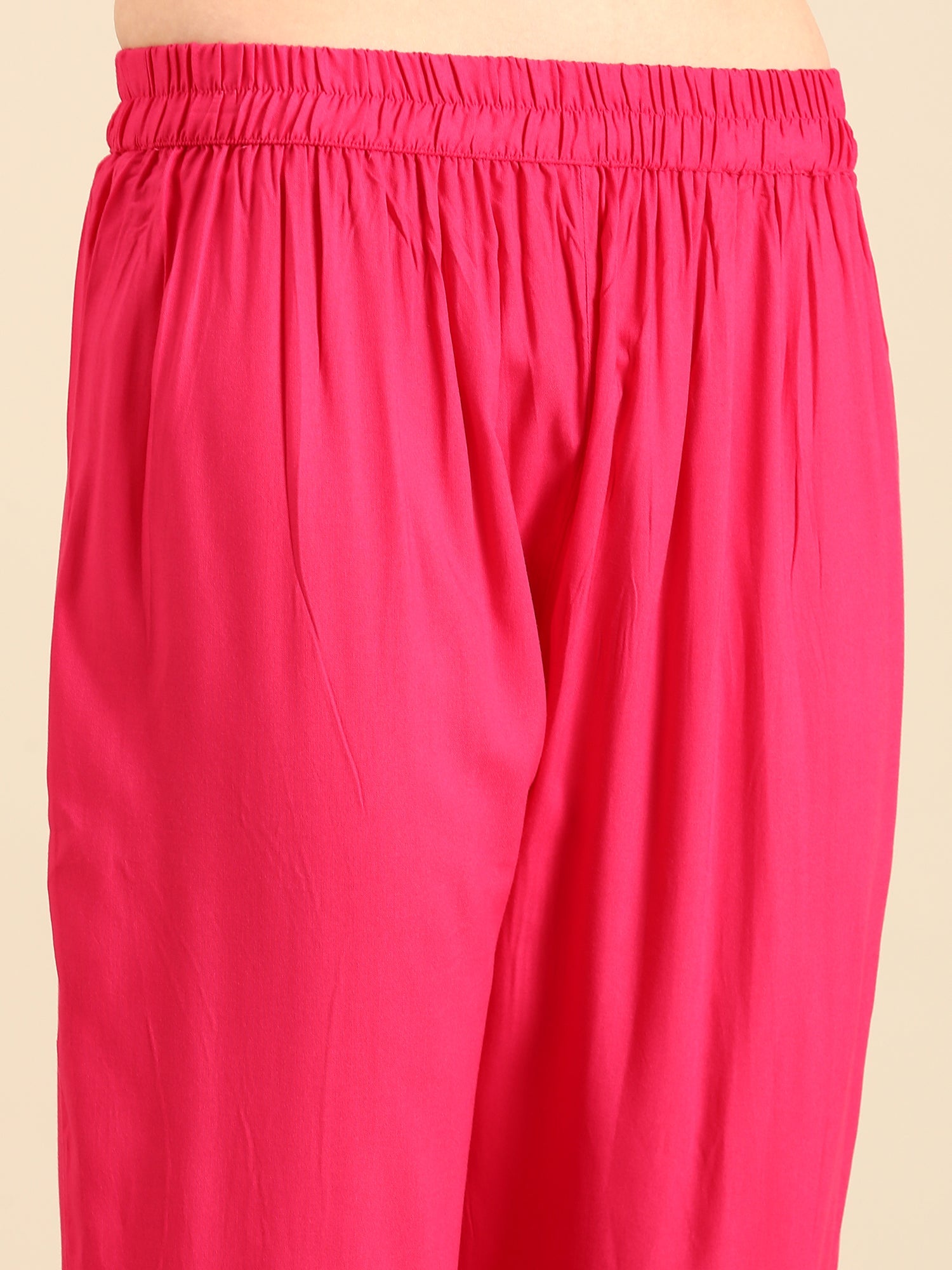 Embrace the elegance of this rose pink rayon suit set, featuring a digital print yoke richly embellished with kardhana beads and hand-applied sequins. The exquisite handwork adds a radiant shimmer, enhancing the delicate fabric's charm. Perfect for festive occasions, this ensemble combines traditional craftsmanship with contemporary style to make you shine with confidence and grace.