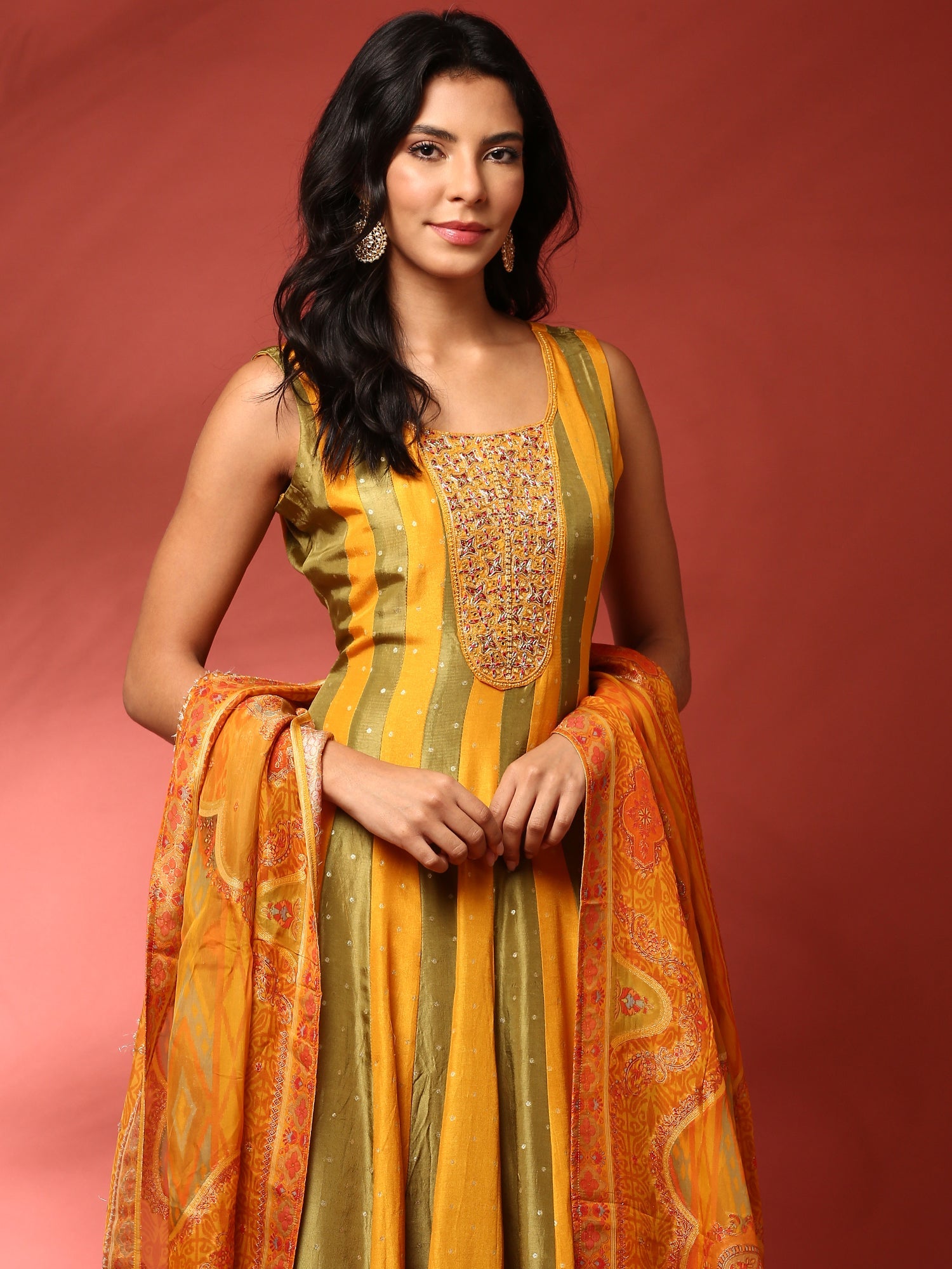 Elevate your traditional wardrobe with this mustard and green striped silk anarkali set, beautifully embroidered to add a touch of elegance. The rich silk fabric offers a luxurious feel, while the intricate embroidery highlights the craftsmanship. Perfect for festive occasions or special events, this set combines comfort with style to ensure you stand out gracefully.