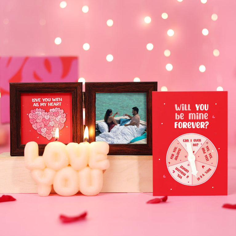 Love deserves more than just words. This Mega Hamper is designed to turn ordinary days into beautiful memories with surprises that feel sweet, playful, emotional, and meaningful. Each hamper brings a different mood of love — from romance and comfort to fun and mischief. It’s a complete celebration of your relationship, packed with thoughtful gestures that make your partner feel truly special.Perfect for couples who love expressing their feelings in different ways - one surprise at a time. The mega hamper consists of :1. Be Mine Forever HamperA sweet and romantic way to set the tone. The artificial rose bouquet keeps things classic and timeless, while the glitter bomb filled with rose petals adds a fun surprise element. Additionally, it includes a cute bouquet card. Romantic, playful, and full of charm.2. Proposal HamperFor saying what’s in your heart — even if you’ve said it a hundred times before. The spinwheel propose card keeps it fun, the love you candle adds warmth, and the mini window frame holds onto a memory that matters. Simple, emotional, and meaningful.3. Chocolate HamperSweet and happy — just like love should be. With a pack of six chocolates, it’s perfect for sharing, stealing bites, and enjoying those small, sugary moments together.4. Cuddly HamperComfort packed with cuteness. The red teddy is soft and perfect for hugs, while the mini teddy card adds a sweet little message. The hamper also has a cute teddy candle. Cozy, adorable, and full of feel-good energy.5. Promise HamperFor when emotions run deeper. The promise contract adds a fun yet heartfelt touch, the romantic quotes easel brings warmth, and the promise keychain keeps those words close every day. Honest, thoughtful, and full of meaning.6.Hugs for You HamperThis one's all about closeness and comfort. The pocket hug card is perfect for moments when you miss each other, the cuddle contract keeps things playful, and the I love you doodle mug turns everyday routines into warm reminders.7. Kisses in a HamperFor the playful side of love. The kiss coupon box gives cute reasons to kiss, and the Kissathon game turns affection into something fun, slightly naughty, and memorable. And, the dolphin kissing lamp to set the right mood for a kiss.8.Fun Finale BoxEnding on a light, happy note. The Boodoo doll is cute, silly, and perfect for couples who love teasing, laughing, and keeping things playful.Specifications:Size of the Glitter Bomb - 6.5 x 3.7 inchesSize of the Spinwheel Card - 7.8 x 5.5 inchesSize of the Teddy Card - 6.3 x 5.5 inchesSize of the Promise Contract - 5 x 7 inchesSize of the Pocket Hug - 2.2 x 2.75 inchesSize of the Cuddle Contract - 3.5 x 2.5 inchesSize of the Kiss Coupons Box - 2.2 x 2.2 x 3 inchesSize of the Kissathon Box - 10.16 x 7 cmsSize of Boodoo Doll Box - 4.5 x 8 x 2.5 inchesSize of the Mega Hamper Box - 12 x 12 x 8 inches