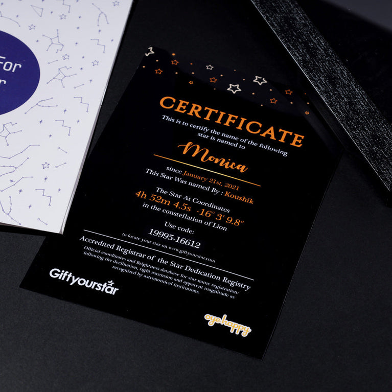 Specifications:Size of the frame: A4Please note that Oye Happy is a facilitator for the naming service, GiftYourStar, which is an Accredited Registrar of the Star Dedication Archives.The star can only be booked for the current year, not for previous years. If you input the date of the occasion as 17/03/1987, the star will automatically be booked for the current year, regardless of the entered date.