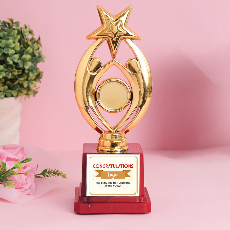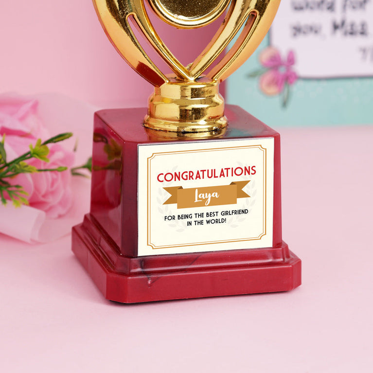 She lifts your mood, laughs at your worst jokes, and loves you on your grumpiest days. That kind of love deserves recognition. This sweet little trophy, personalised with her name, is a charming way to remind her how much you adore her.Specifications:Size of the Trophy – 24 x 9 cm