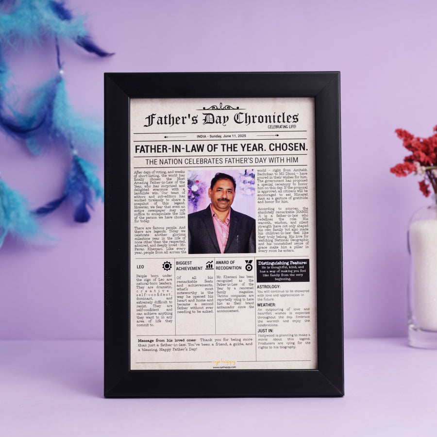 Father-in-law Chronicles - Make your father-in-law a celebrity with a personalized newspaper cover story celebrating his amazing qualities, interests, and nature. This fully customized gift includes a heartfelt message from you, a humorous weather report, an award section, and more.