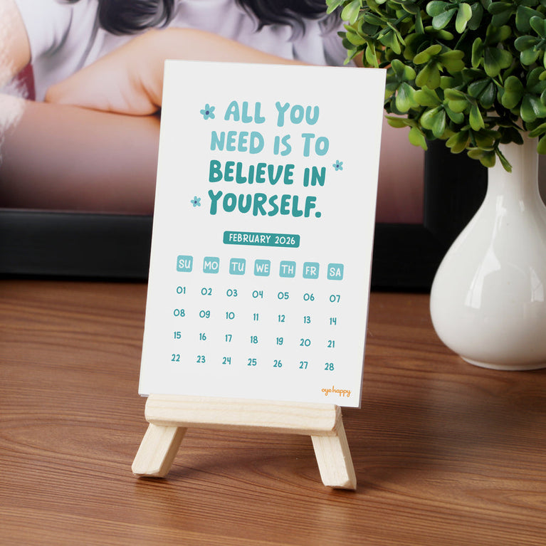 A calendar that will be your biggest cheerleader for every month of the year 2026This Affirmation Calendar gives you and your loved ones a reason to smile each month with its cute design and powerful messages. From “I am enough” to “I am worthy of good things” this calendar keeps the positivity flowing throughout the year. Specifications-Easel Size : 6 x 4 inches, crafted in pine wood.Calendar print : 8.5 x 12.5 cms