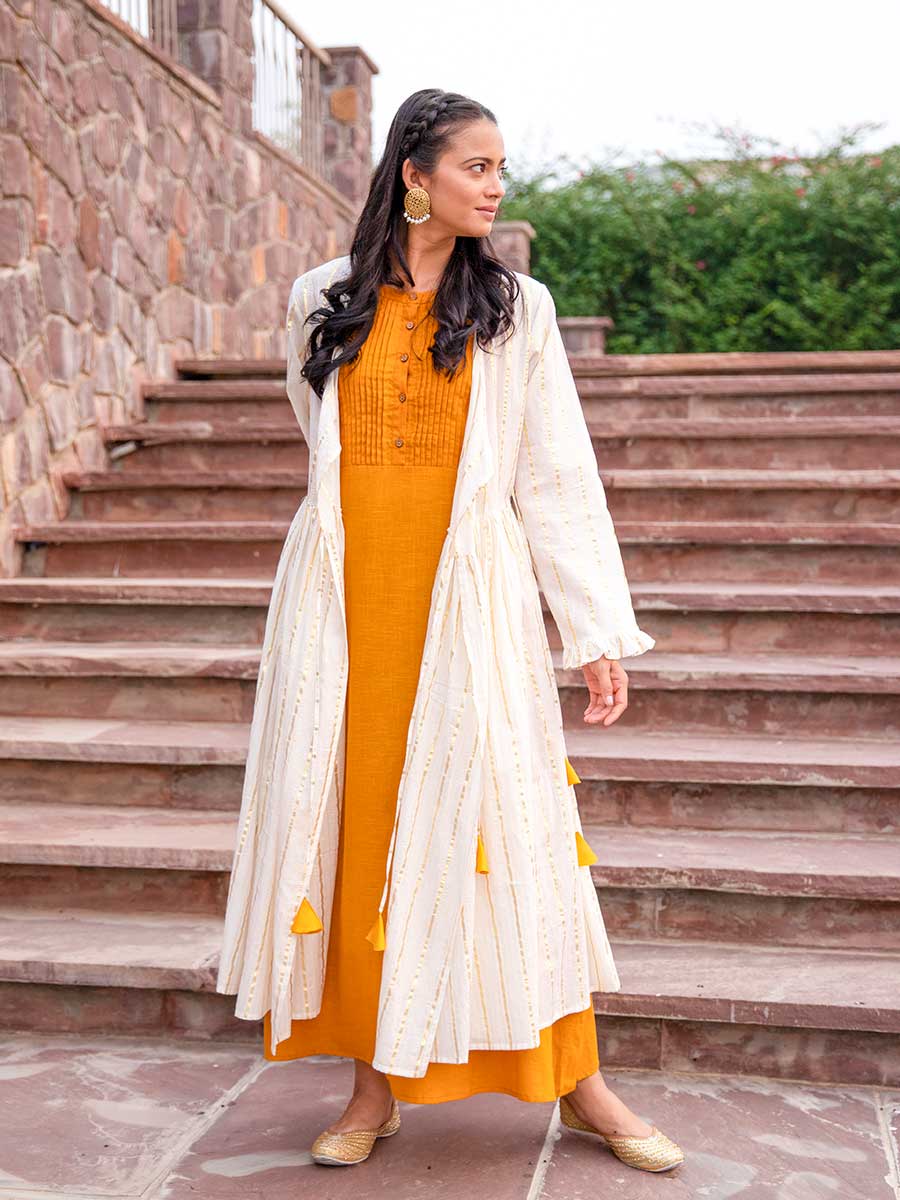 An A-line long cotton slub sleeveless pintuck dress – extremely versatile and can be styled in various ways or combined with our angrakha jackets to make a festive set.