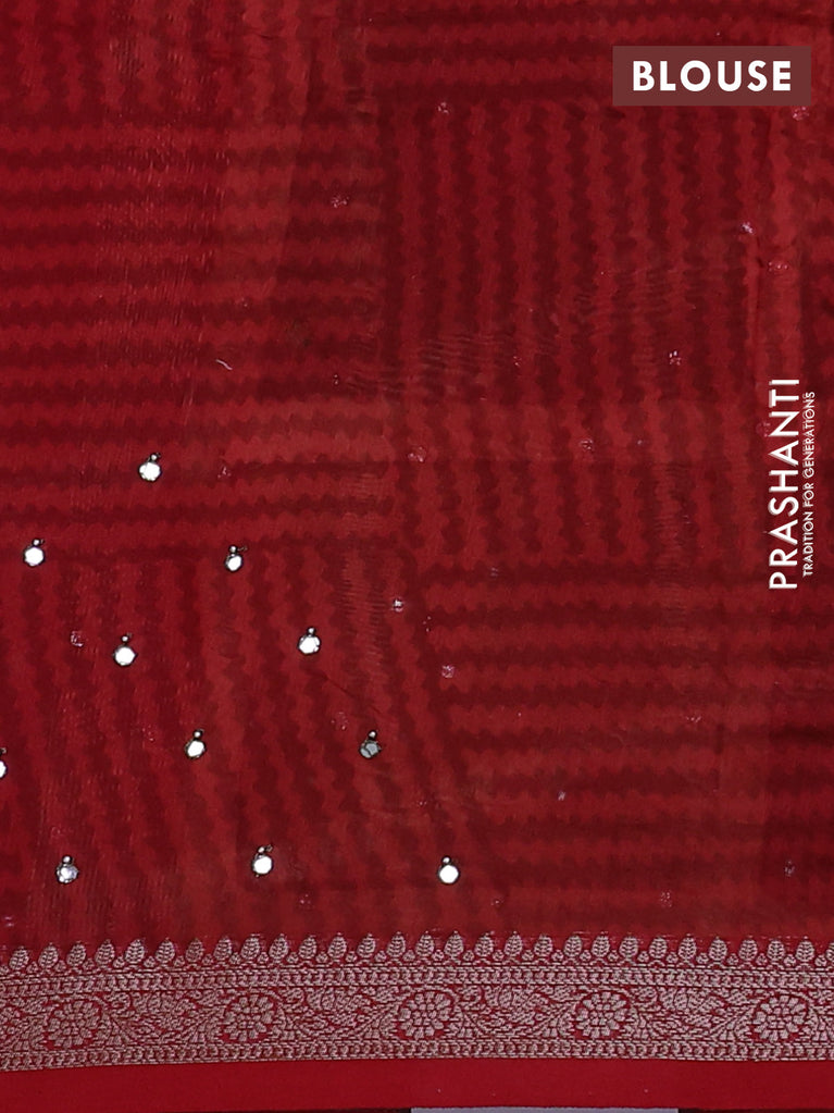 Chanderi silk cotton saree sap green sandal and kumkum red with allover geometric prints & mirror work and woven border