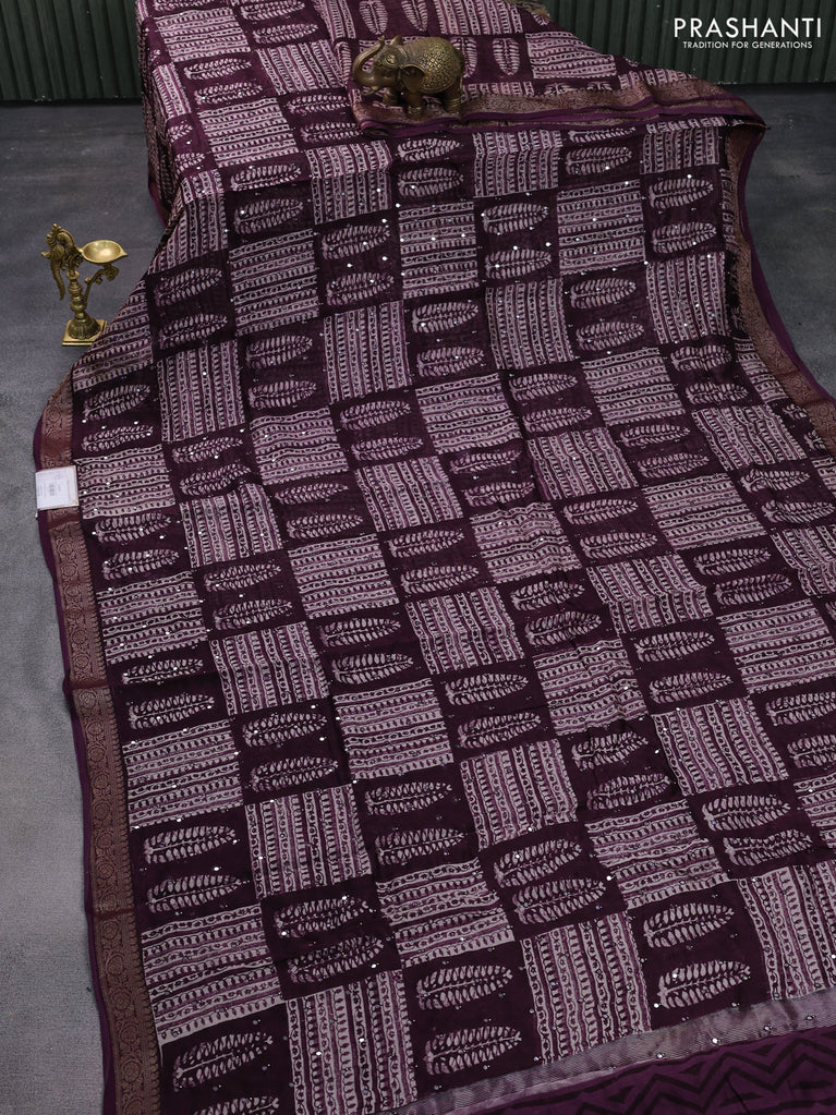 Chanderi silk cotton saree wine shade and beige with allover zig zag prints & mirror work and woven border