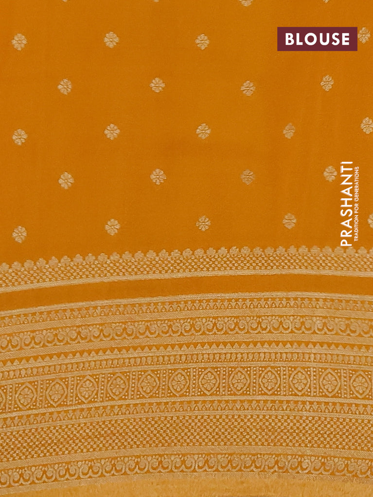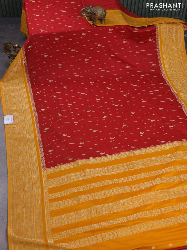 Banarasi semi crepe saree maroon and mango yellow with allover zari woven butta weaves and long zari woven border