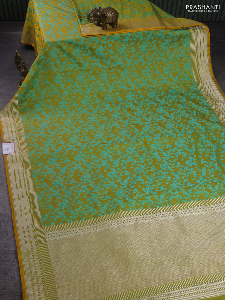 Banarasi semi mushru silk saree dual shade of mustard and teal green shade with allover self emboss and zari woven border