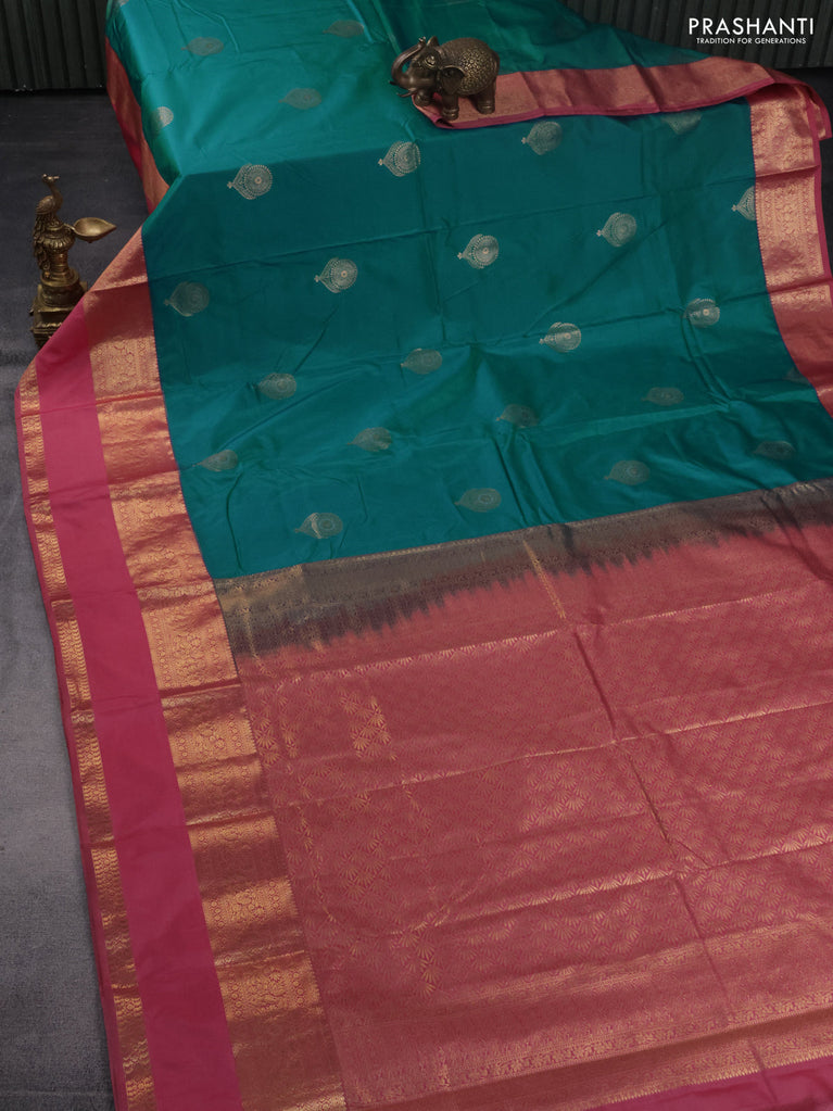 Bangalori silk saree teal green shade and magenta pink with zari woven buttas and zari woven border