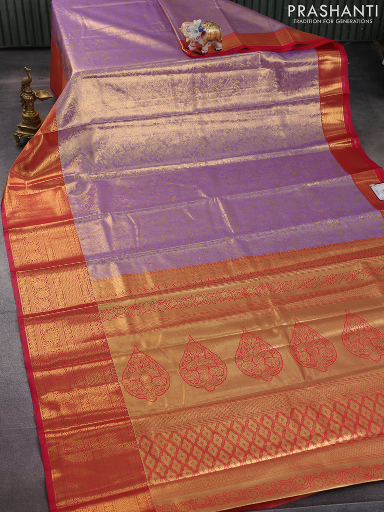 Bangalori tissue silk saree lavender and reddish pink with allover zari woven brocade weaves and long zari woven border