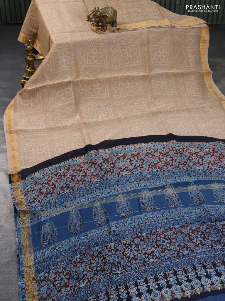 Chanderi bagru saree beige and blue with allover bandhani prints & ajrakh printed pallu and zari border & ajrakh printed pallu